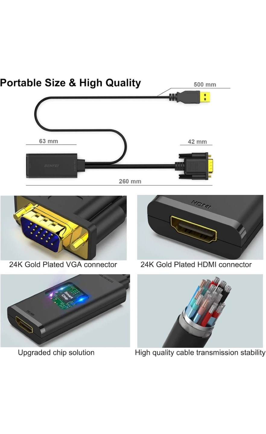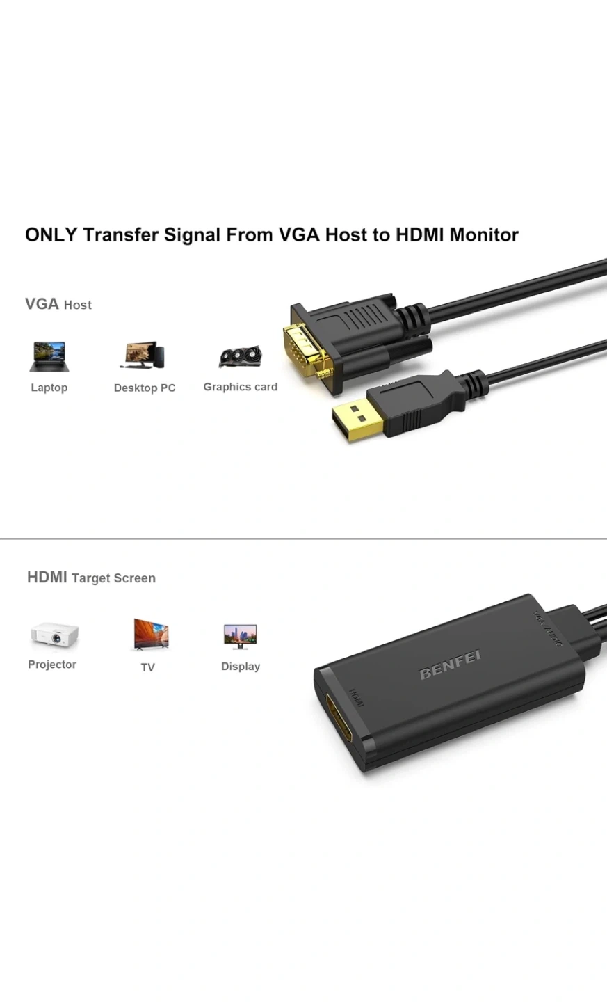 Selling a BENFEI VGA to HDMI adapter. It allows you to connect devices with a VGA output to displays with an HDMI input. Great for older computers or laptops that need to connect to modern monitors or TVs!
