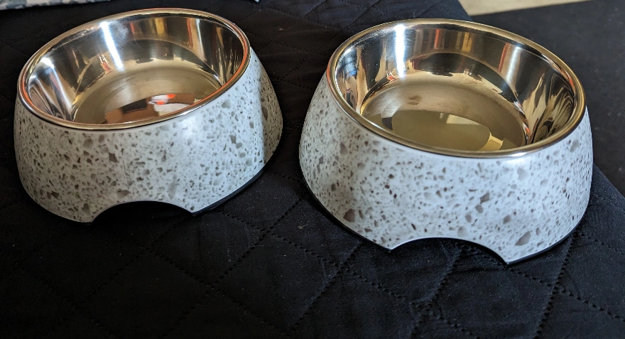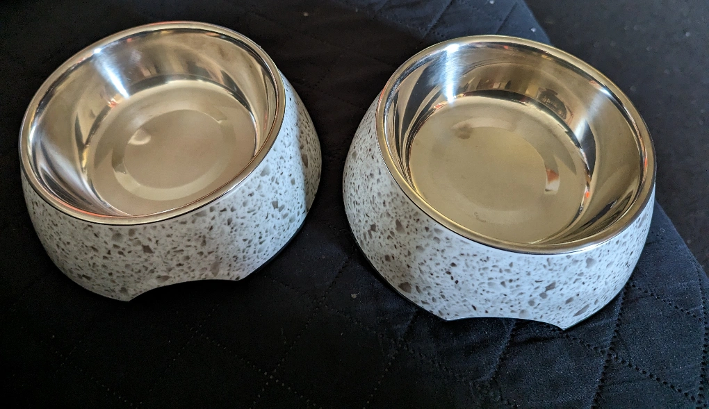 Stainless-steel bowl comes out of the decorative melamine base for easy cleaning.
