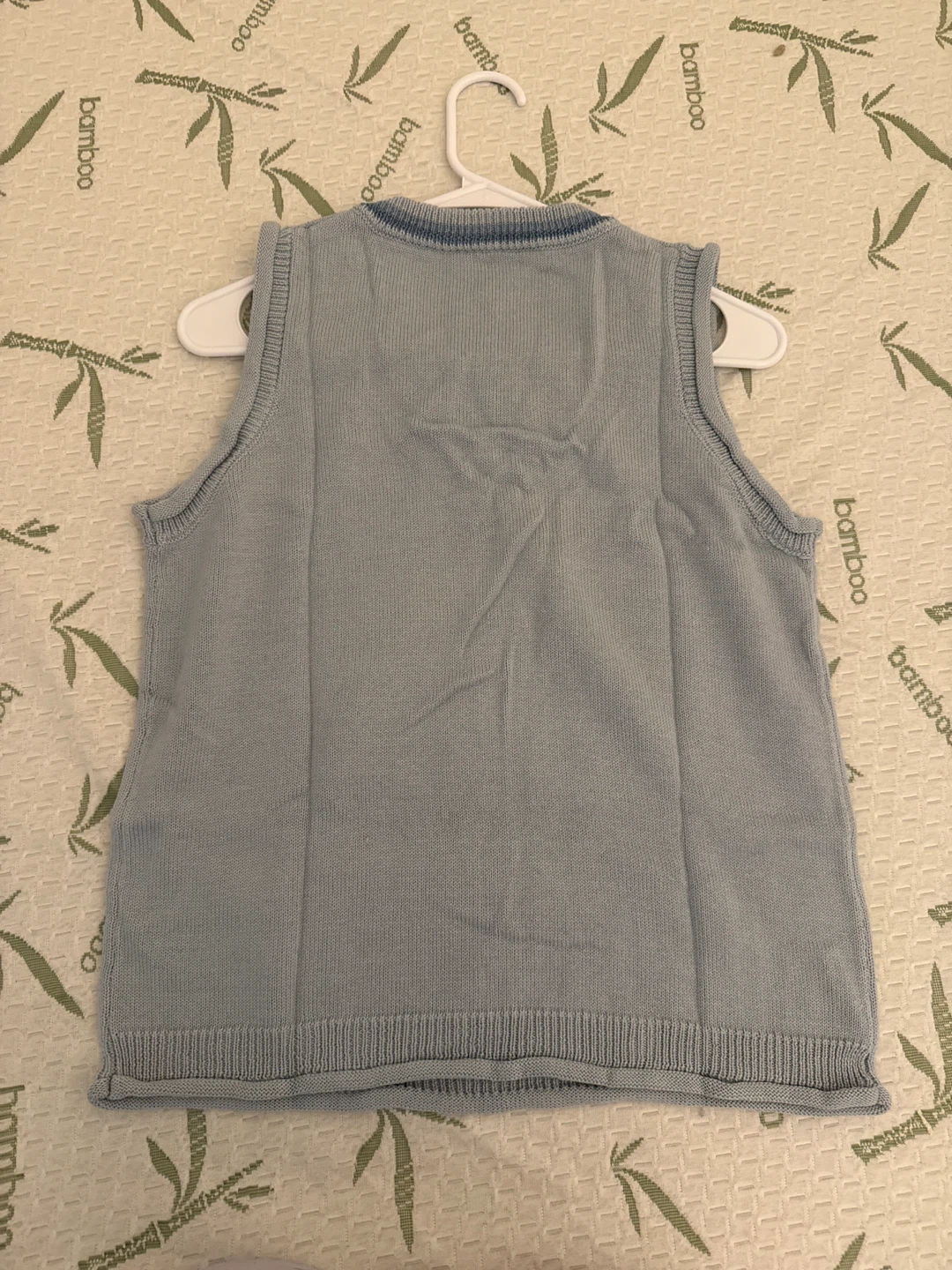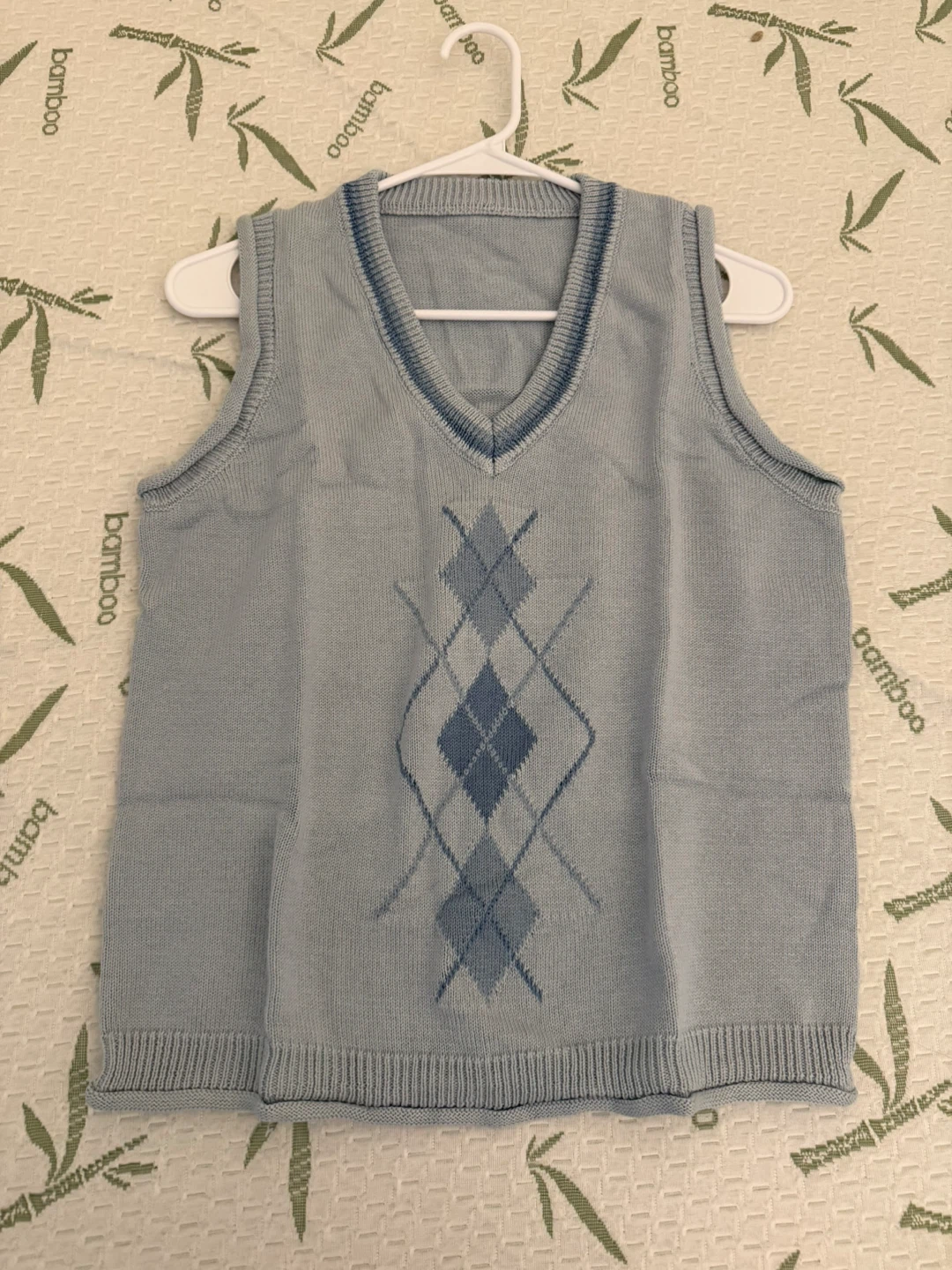 Light blue knit vest with an argyle pattern. Perfect for layering!