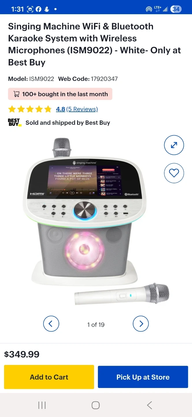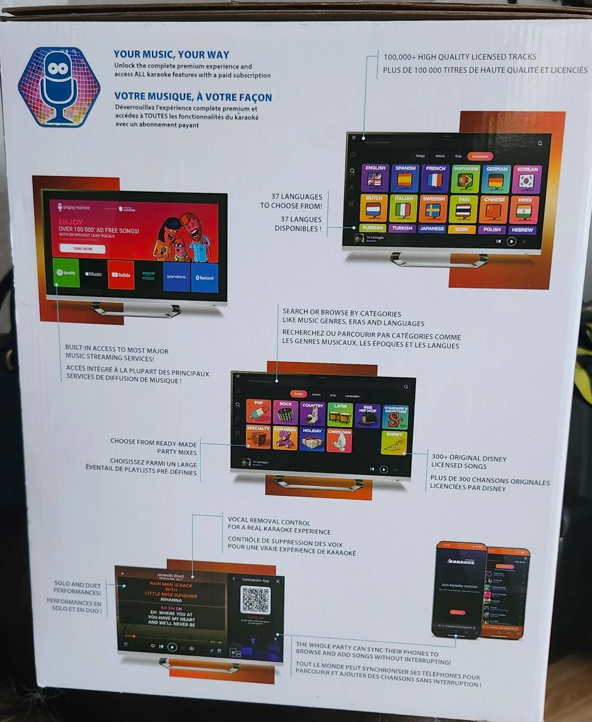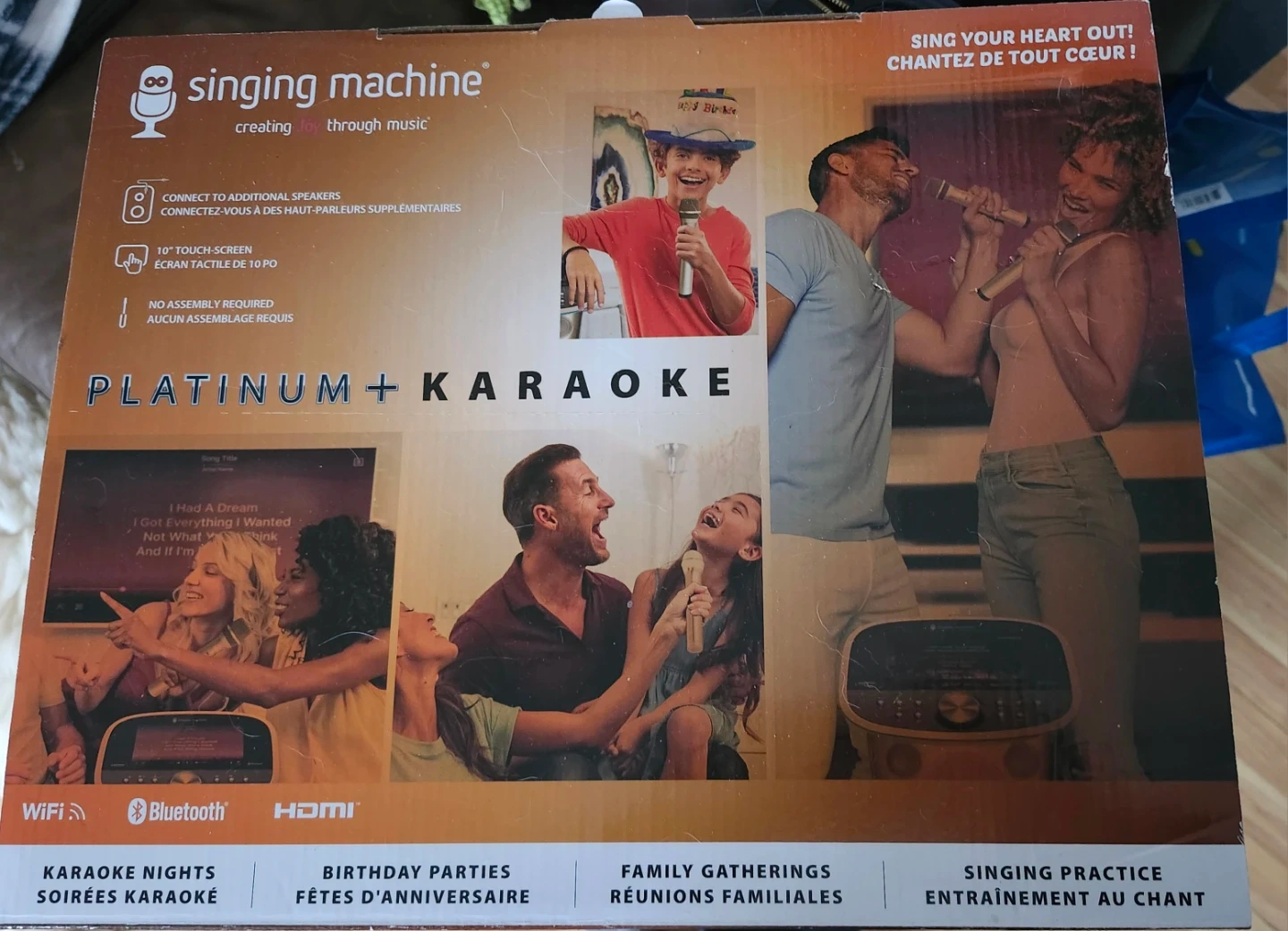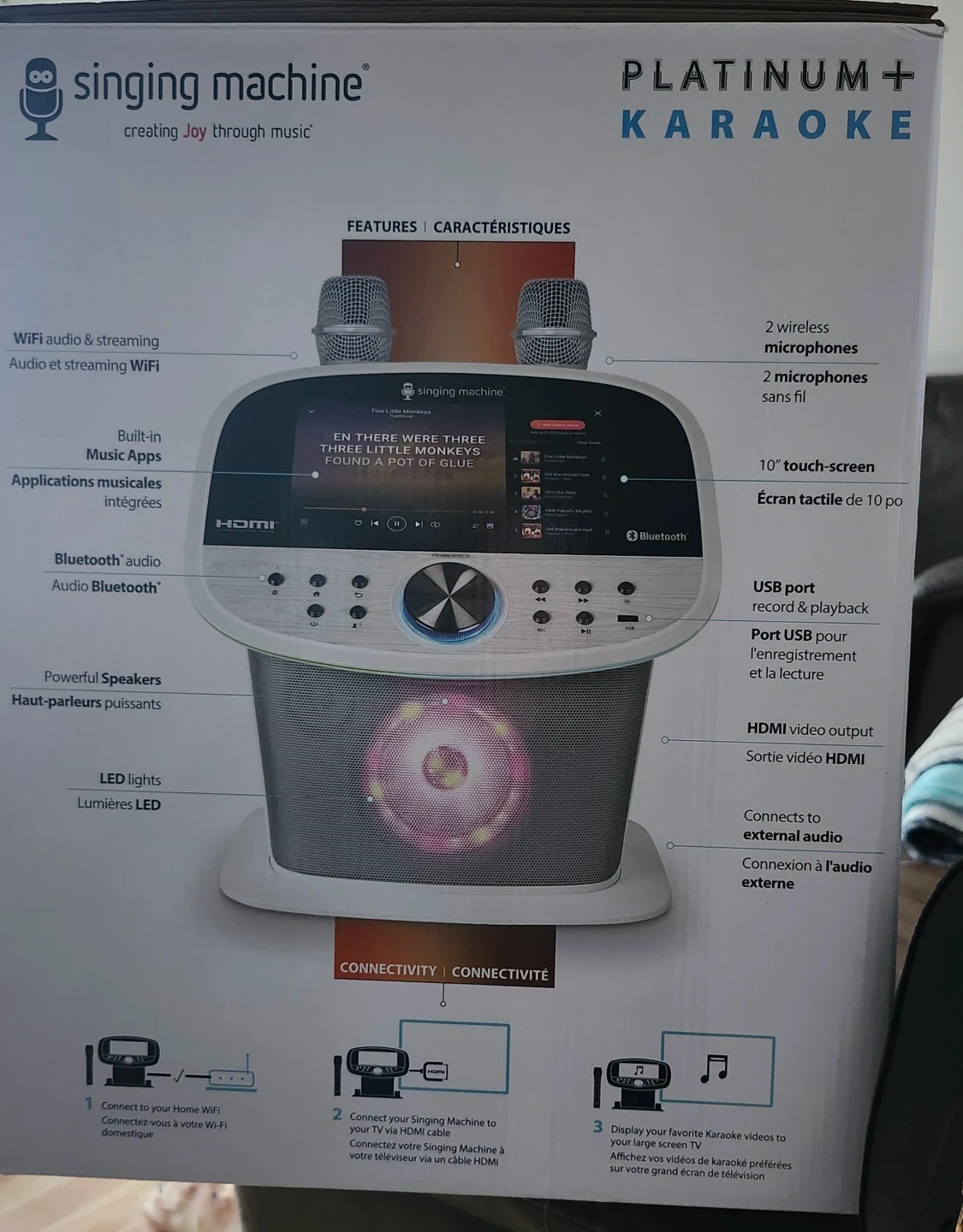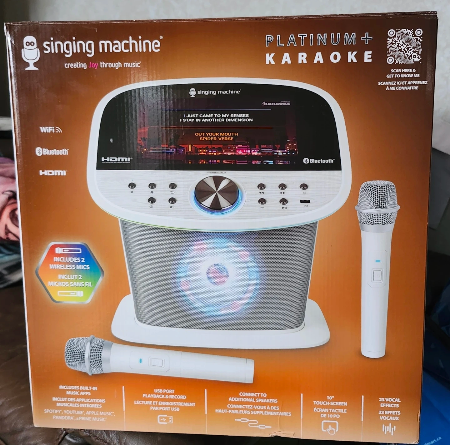 Get ready to sing your heart out with this Singing Machine Platinum Karaoke system! It comes with two wireless microphones, a 10" touch screen, and built-in music apps like Spotify, YouTube, Apple Music, Pandora, and Prime Music.