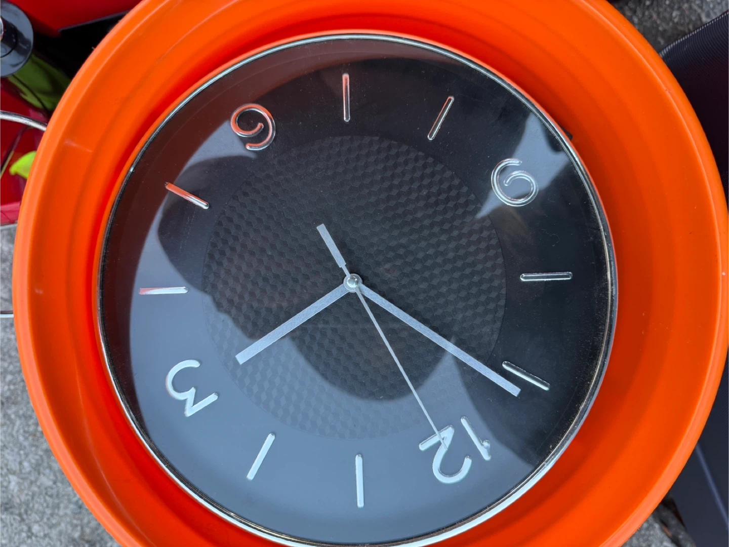 Selling an wall clock. It has a black face with silver hands and numbers. It would add a nice pop of colour to any room!