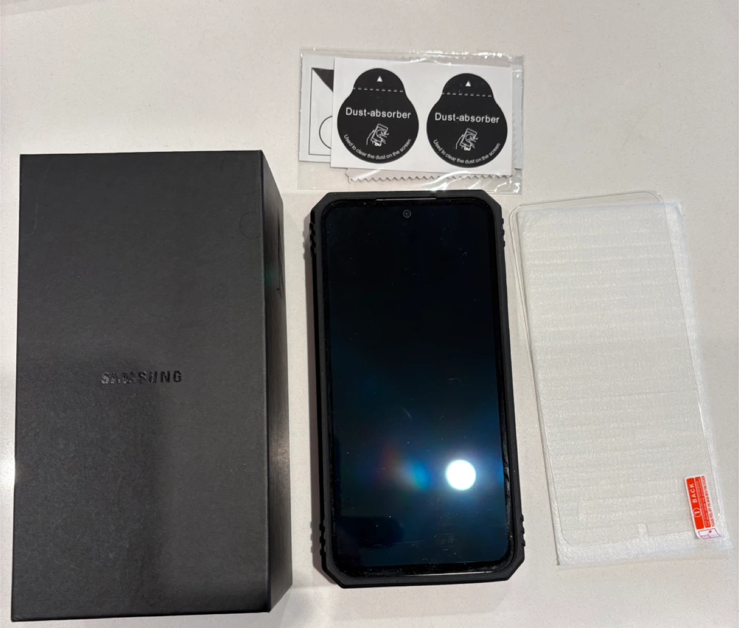 Includes case , a screen protector, dust absorbers, a charger and original box too!