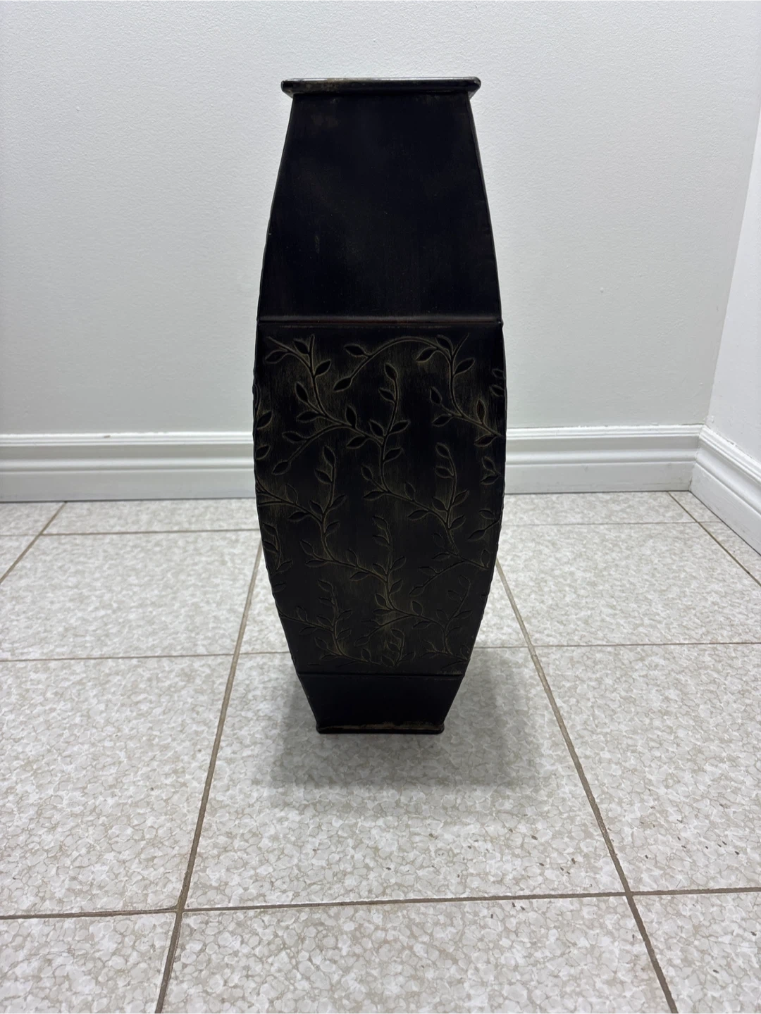 Selling a decorative metal vase. It's brown with a leaf pattern design. Perfect for adding a touch of elegance to any room!