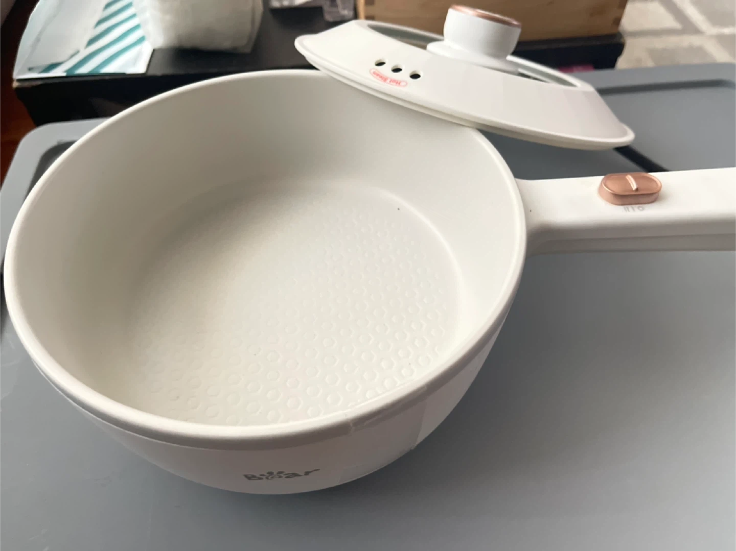 Selling a Bear brand electric hot pot! It's in great condition and perfect for small meals or heating up leftovers. The pot is white with rose gold accents and comes with a lid. It’s super convenient for quick and easy cooking!