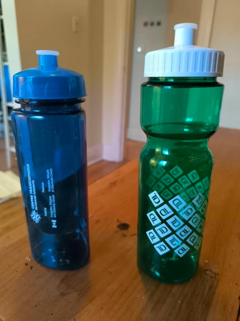 Giving two water bottles! One is blue and has the Centre Francophone du Grand Toronto logo. The other is green with a TD logo pattern. Both are in great shape!