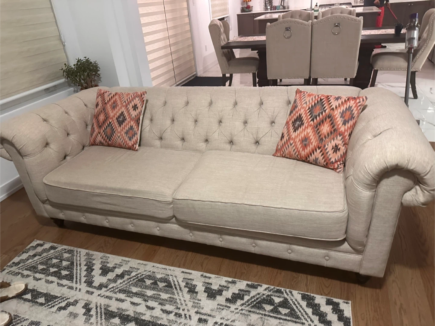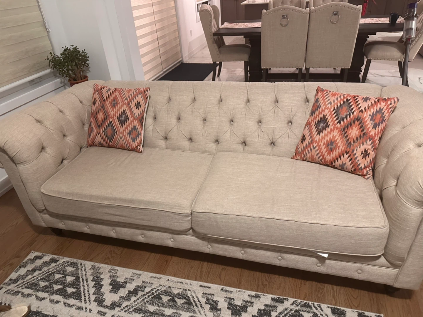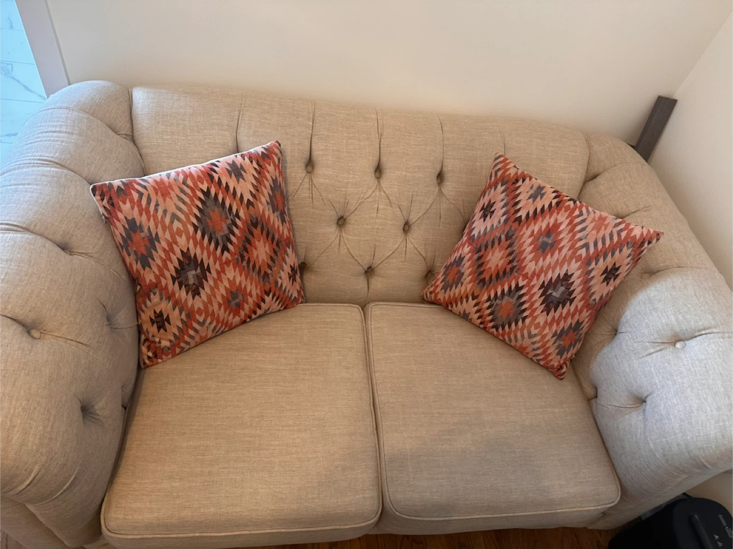 Selling a lovely beige Chesterfield loveseat sofa! It's in great condition and would be a beautiful addition to any living space. The tufted design and rolled arms give it a classic, elegant look. Perfect for a small apartment or cozy nook!