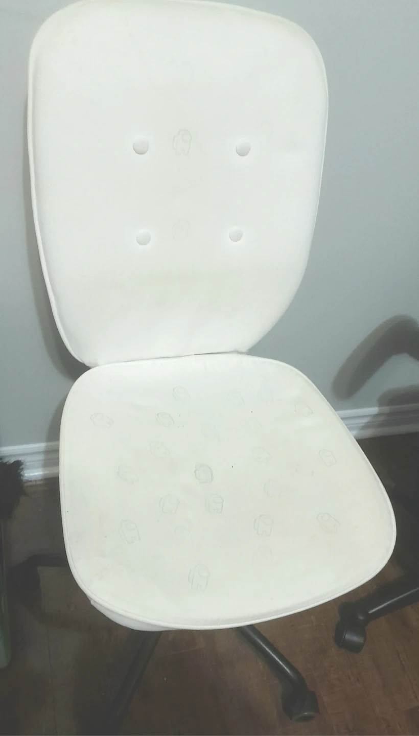 Here's a white office chair with a fun Among Us design on the seat and back. It's in good condition and ready for a new workspace! for free free