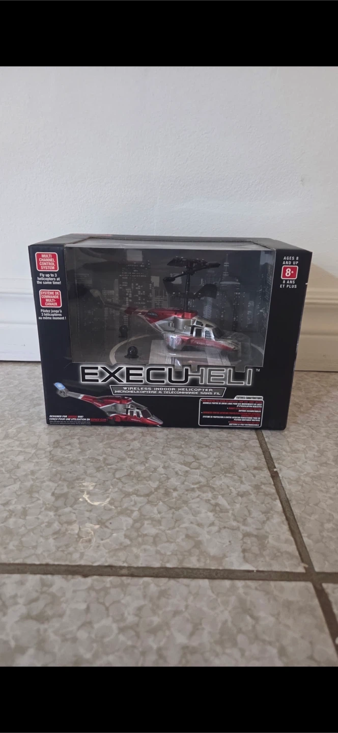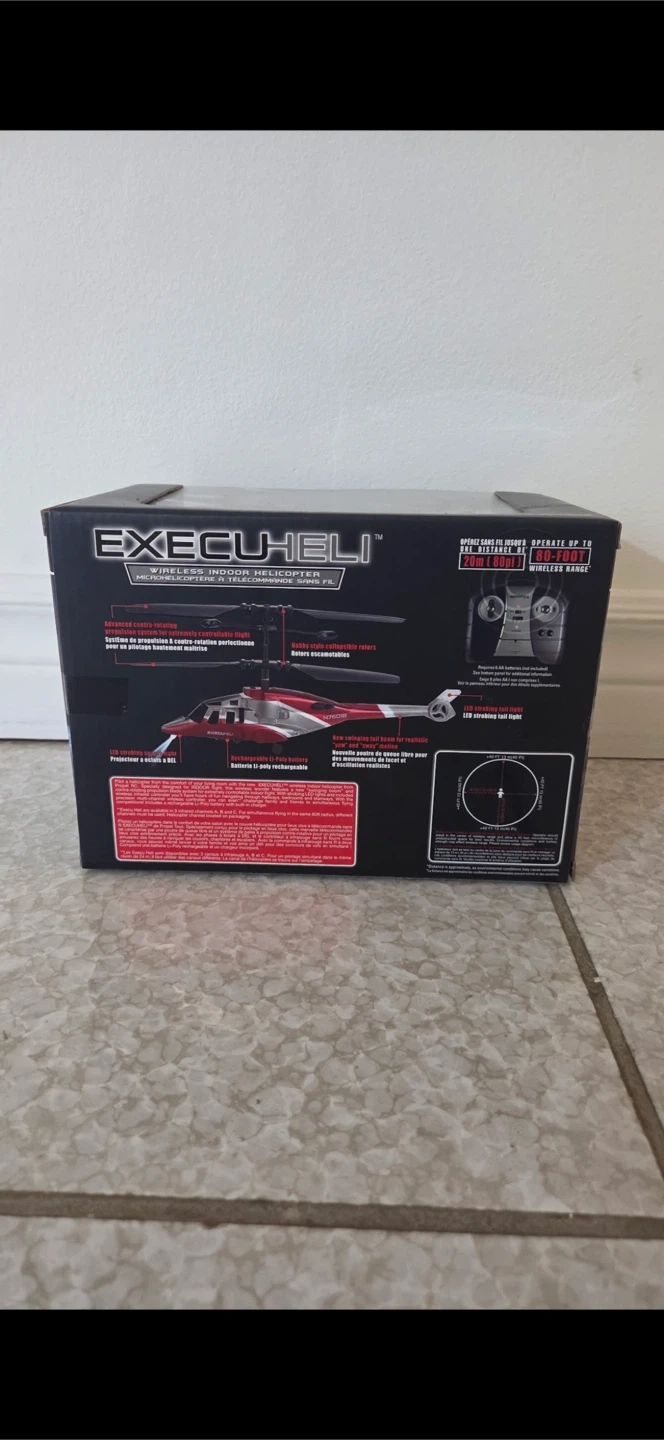 Selling a brand new, in-box Execuheli Wireless Indoor Helicopter! It's ready to fly and provides hours of fun. Perfect for indoor flying with its precise controls and stable hovering. The box shows it operates up to 3 channels and has a wireless range. It also has an LED striking tail light for enhanced visibility!