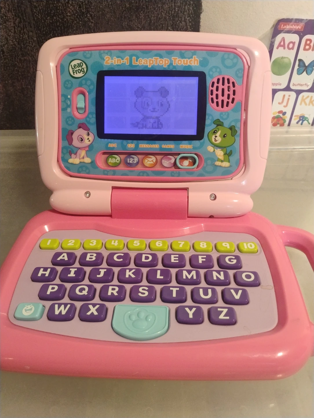 Selling a cute LeapFrog 2-in-1 Leaptop Touch in pink! It's a fun and educational toy for kids. Your little one can learn ABCs, numbers, messages and music. It's in great condition and ready for a new friend