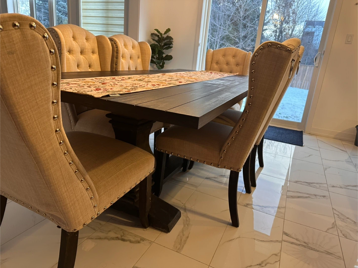 Selling a dining table with 6 chairs. The table has a dark wood finish, and the chairs are upholstered in a neutral fabric with decorative nailhead trim. It's in great condition and would be a lovely addition to any dining space