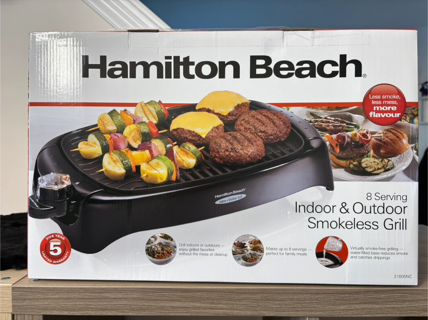 Selling a brand new Hamilton Beach Indoor & Outdoor Smokeless Grill! It's an 8-serving grill that's perfect for family meals. It's designed for virtually smoke-free grilling with a water-filled base that reduces smoke and catches drippings. Enjoy grilling indoors or outdoors without the mess or cleanup!
