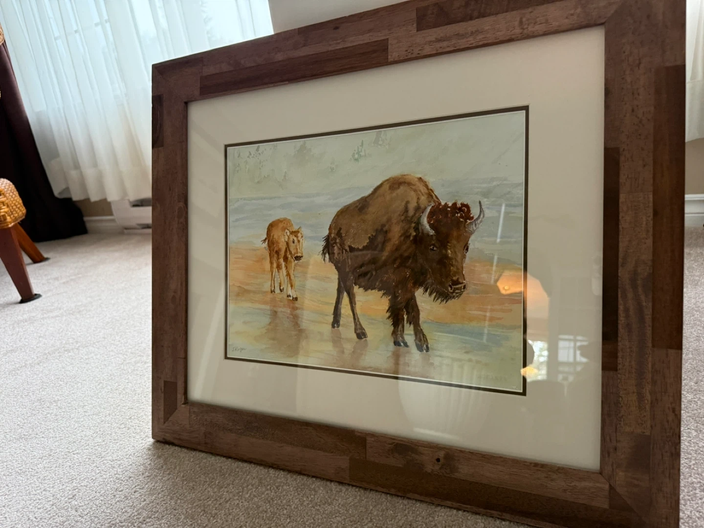 Beautiful framed watercolor artwork depicting a mother bison and her calf. The painting has a rustic wooden frame, adding to its charm. It's ready to bring a touch of nature to your home!