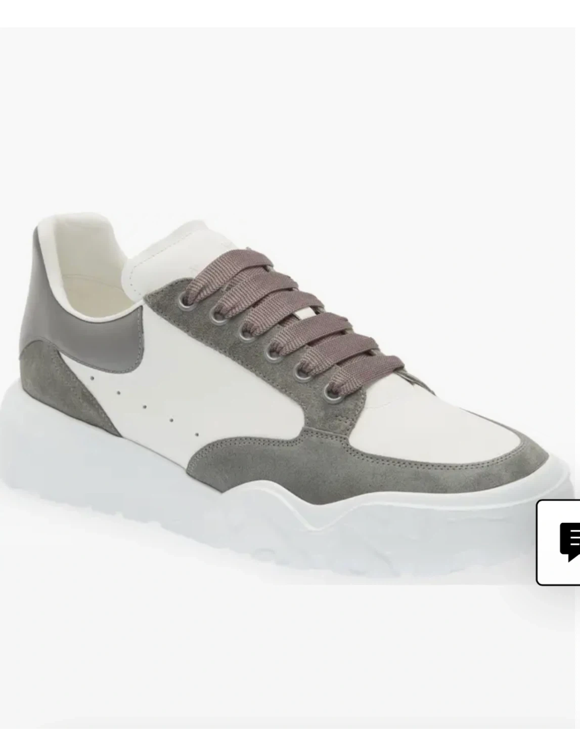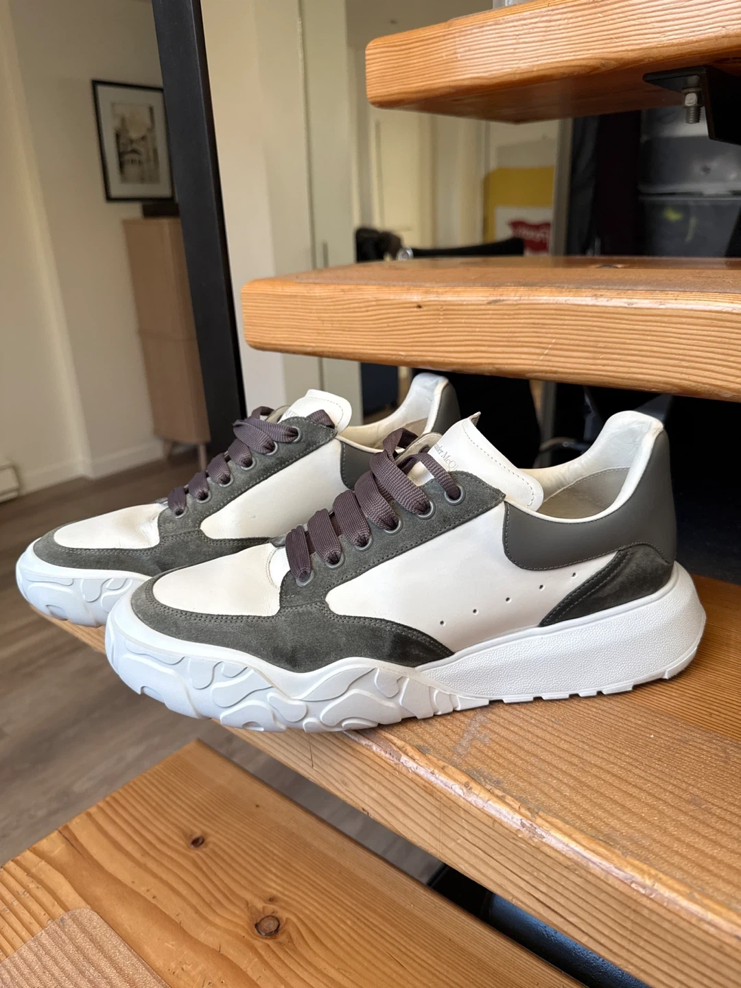 Selling a pair of Alexander McQueen Court Trainer Sneakers for men. These stylish sneakers feature a sleek design with a mix of white and grey tones. Perfect for adding a touch of luxury to your casual outfits!