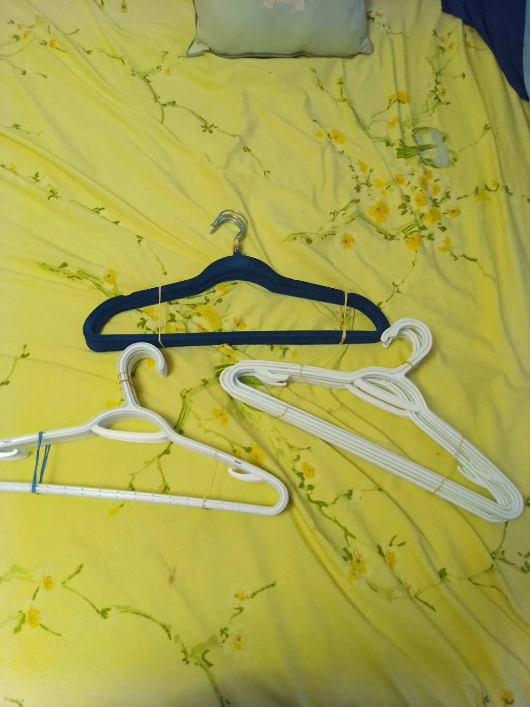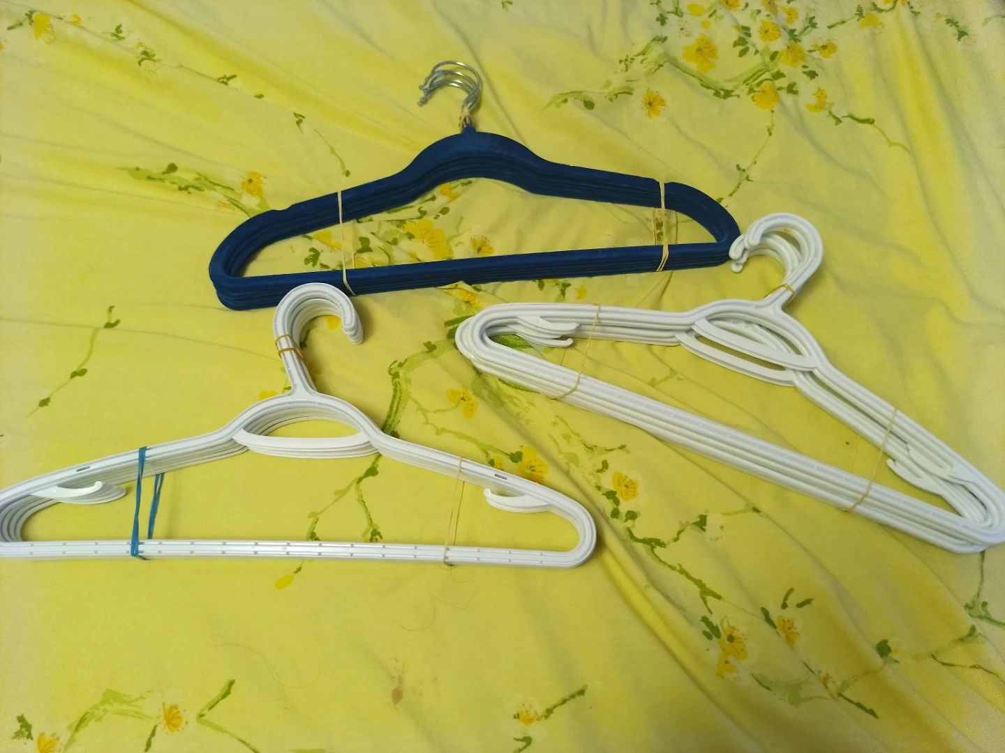 Selling a set of clothes hangers! There's a blue velvet one and several white plastic hangers. They're in great condition and ready to organize your closet 10 for $1.00