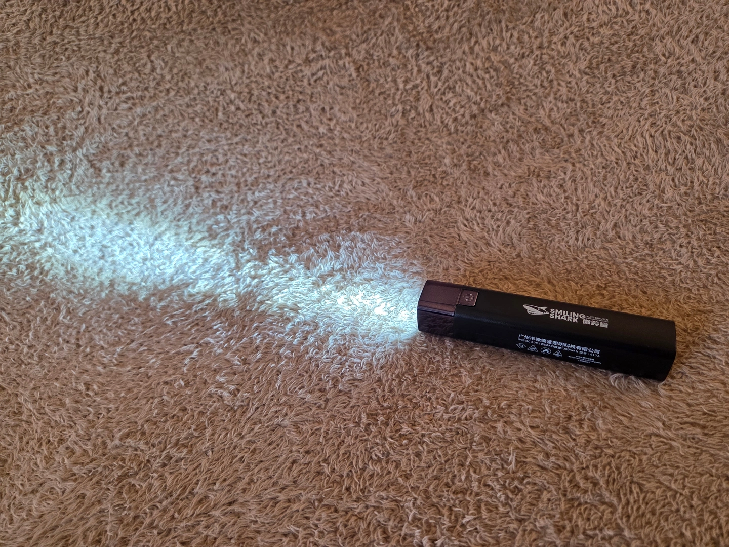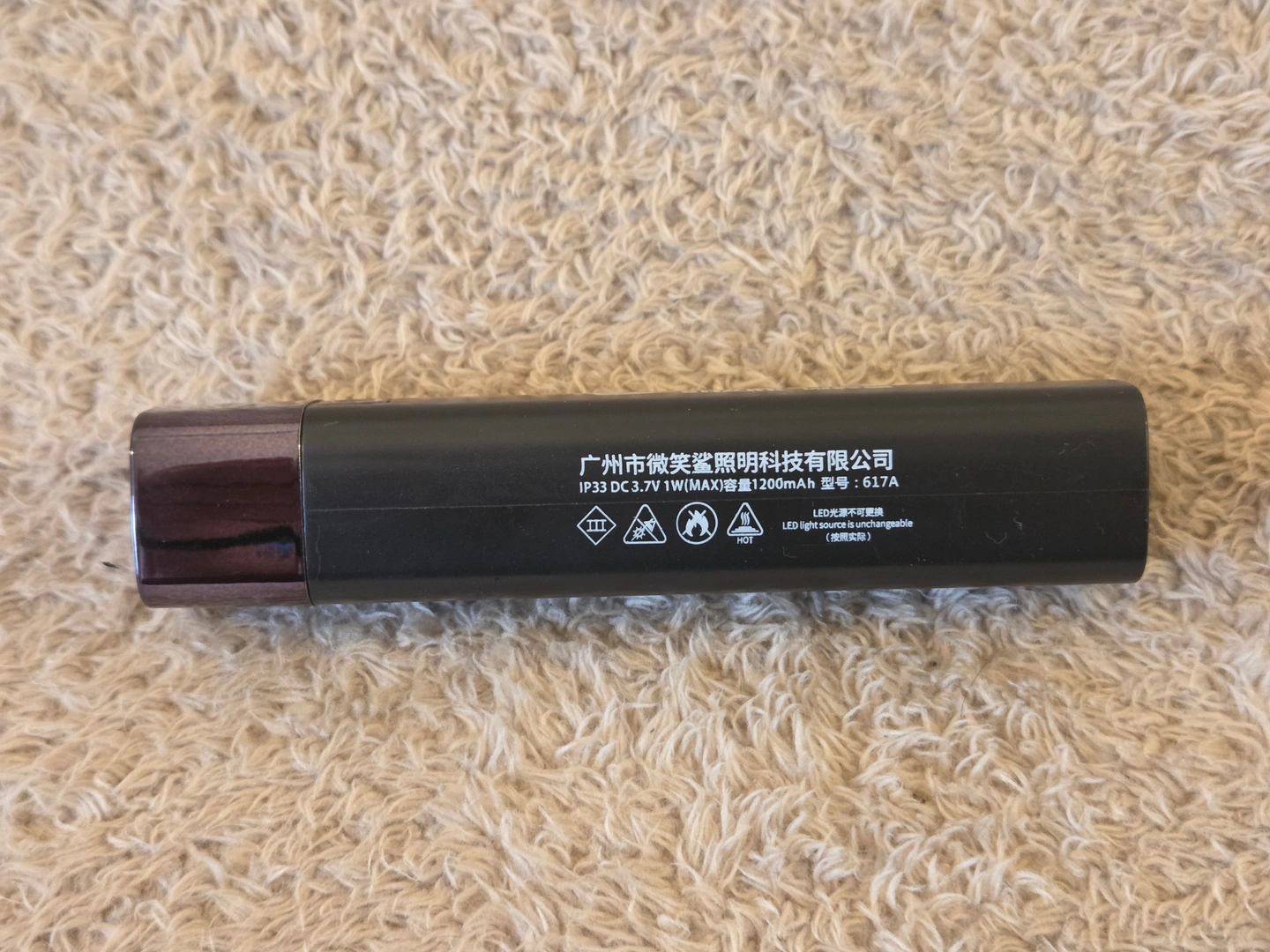 Compact USB-rechargeable flashlight by Smiling Shark, model 617A. Built-in 1200mAh battery, 1W LED and IP33 splash resistance – a handy light for home, glovebox, hallway power outages or camping. Single-button operation, USB-A output and micro-USB charging port on the tail for easy top-ups with any phone charger.