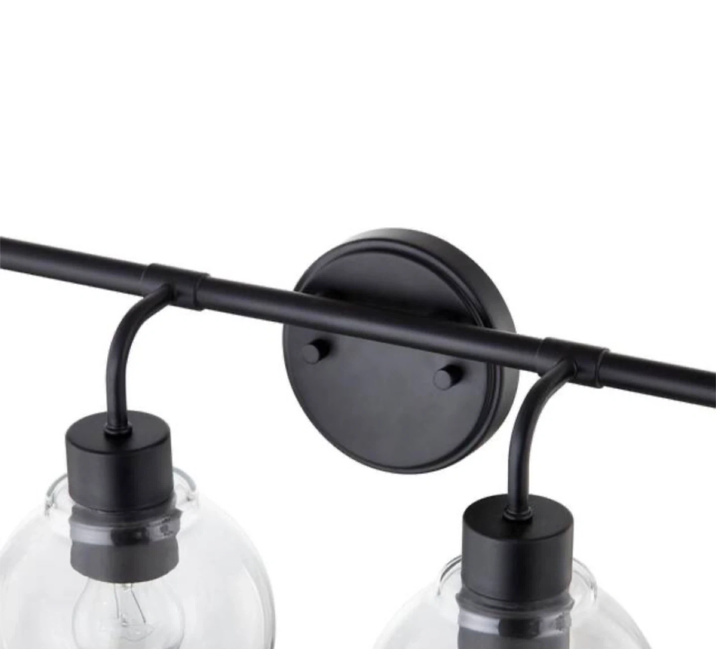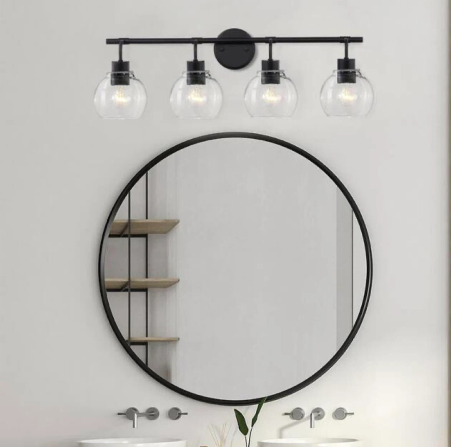 Selling a 4-light bathroom vanity light fixture in black! The dimensions are approximately 30.5 inches wide and 9.5 inches high. It's a stylish addition to any bathroom setup. Bulbs are not included.