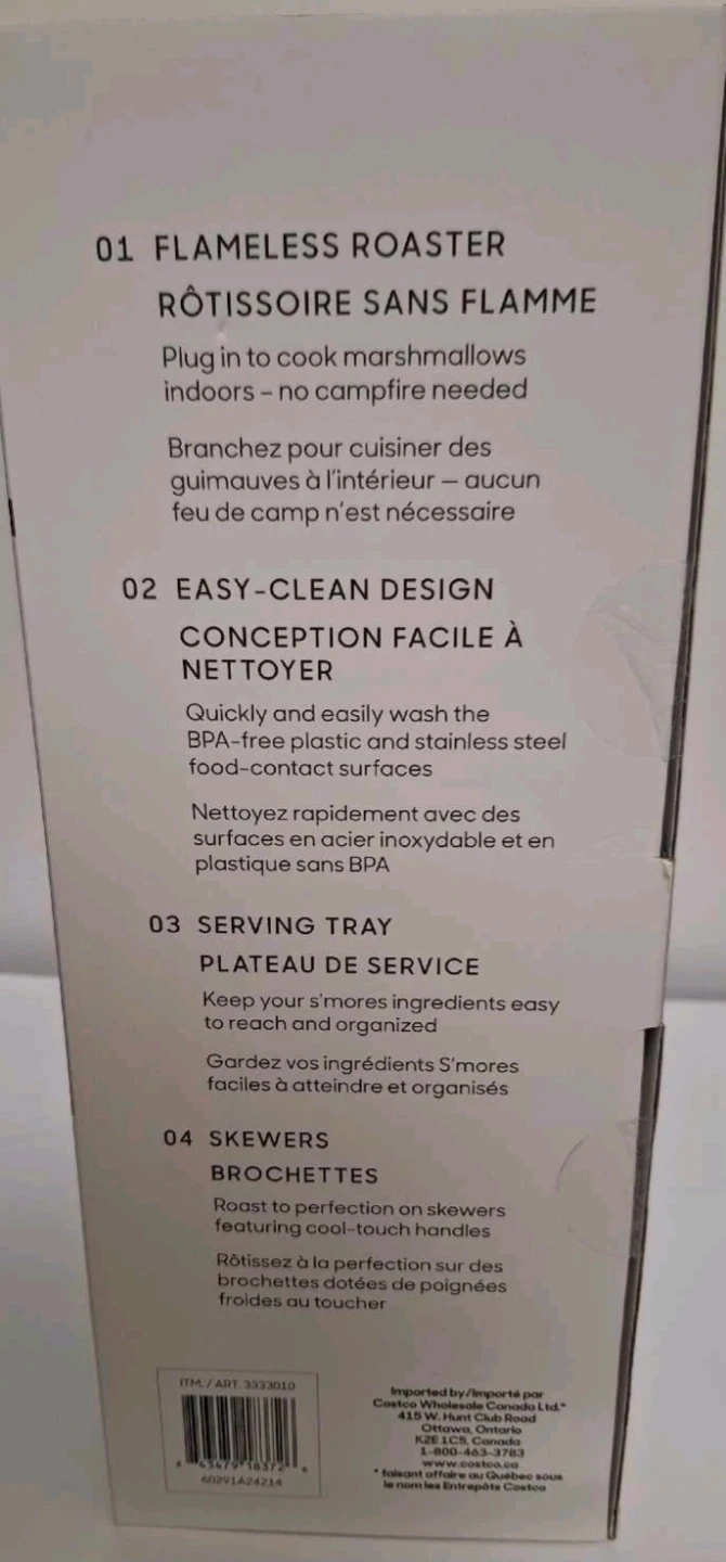 Sharper Image S'mores Maker Machine It's a flameless roaster, so you can enjoy s'mores indoors without a campfire. The design is easy to clean, with BPA-free plastic and stainless steel food-contact surfaces. It also includes a serving tray to keep your s'mores ingredients organized and 4 skewers with cool-touch handles