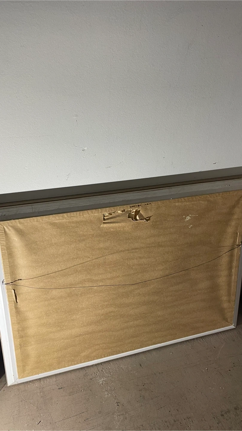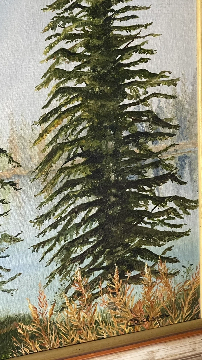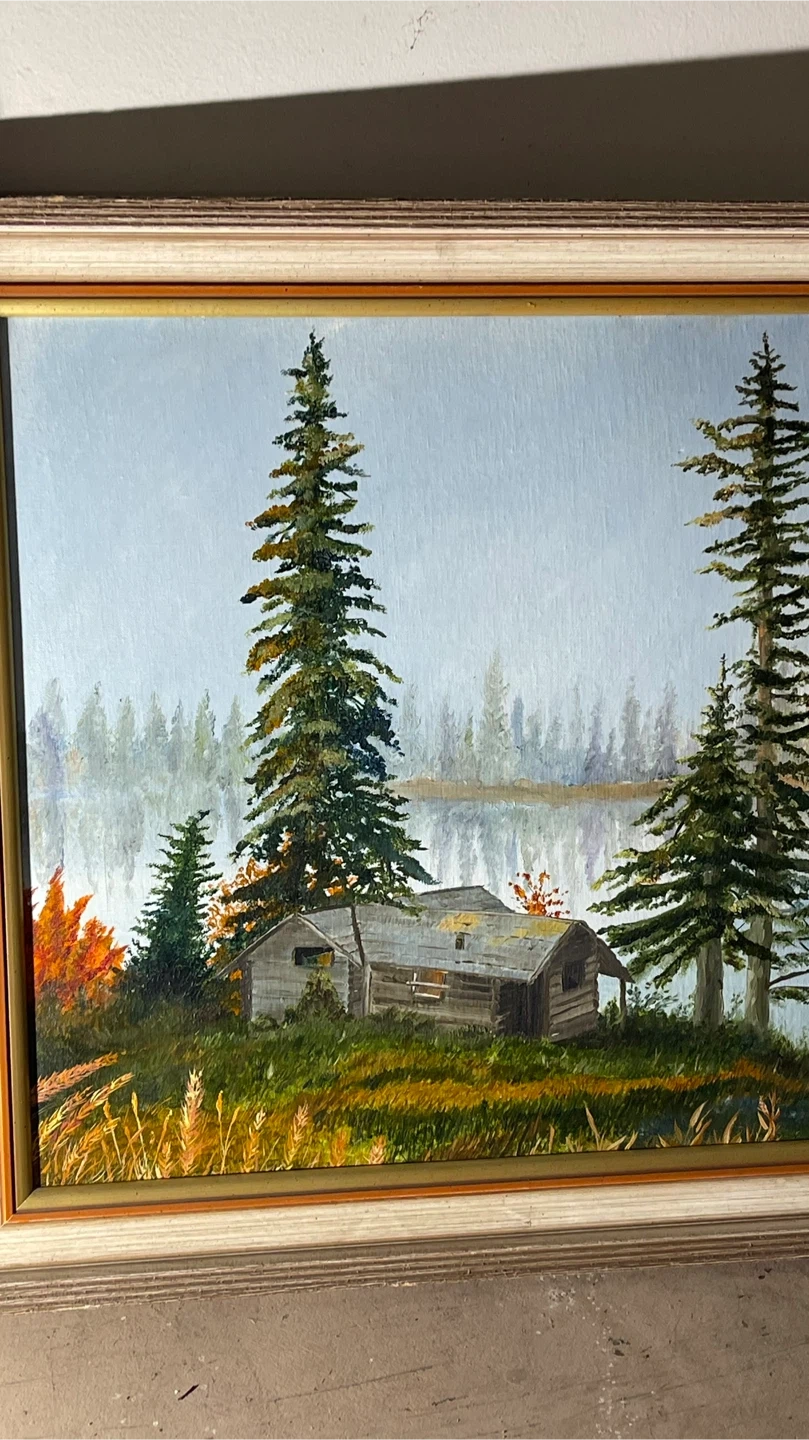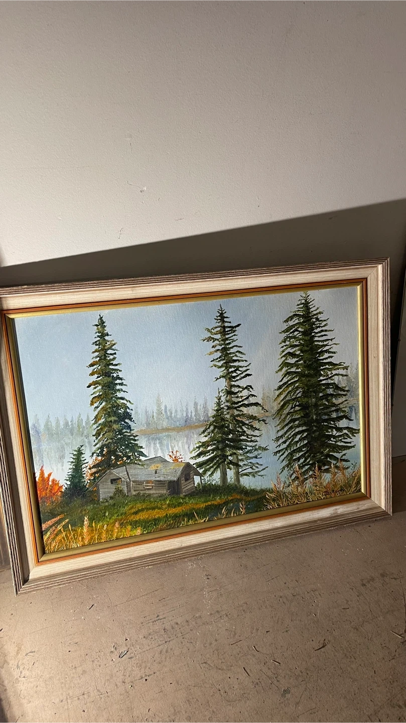 Selling a framed landscape painting featuring trees and a cabin by a lake. It's in good condition and would look great in any home!