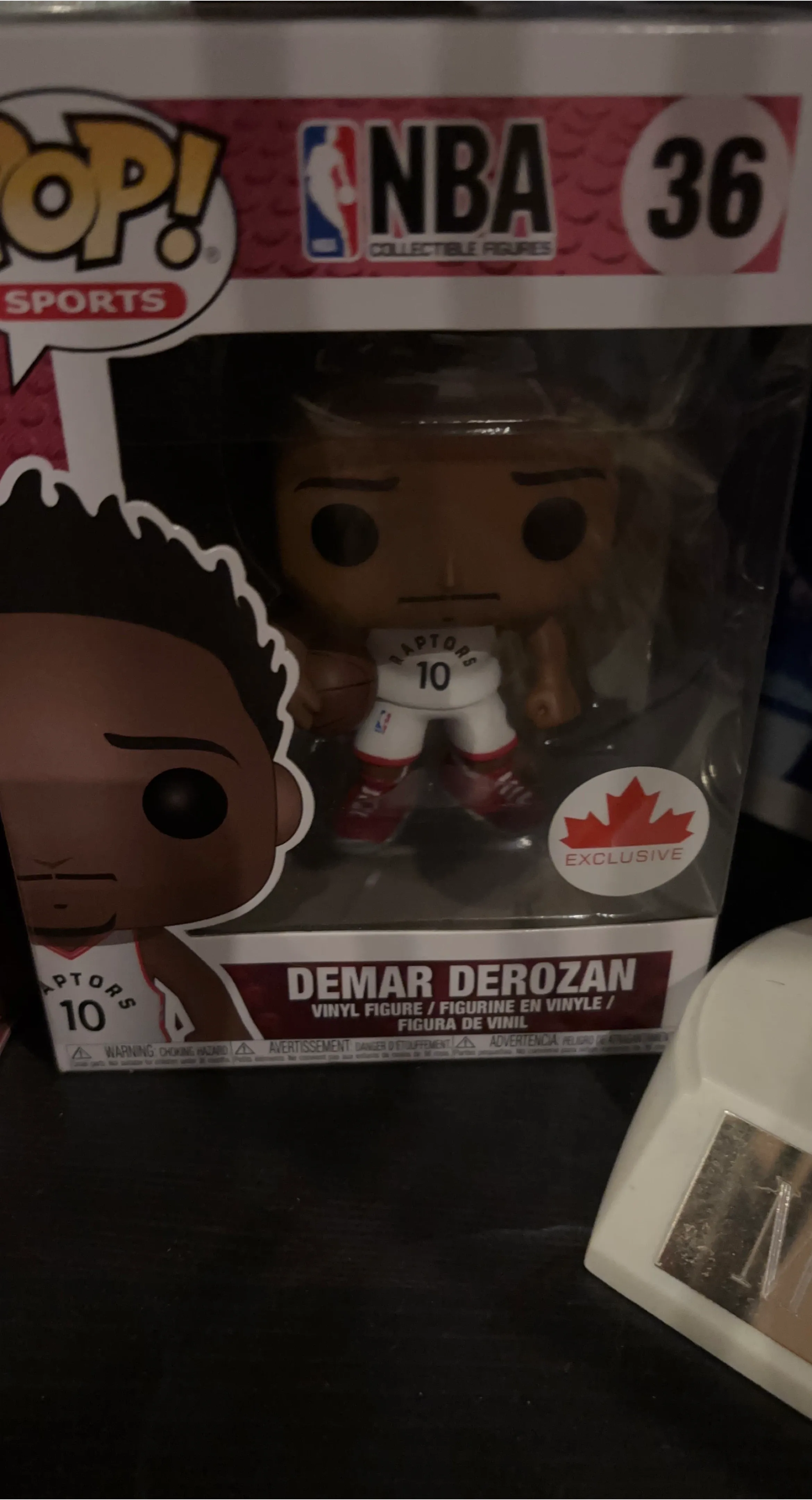 Selling a Funko Pop! NBA collectible figure of Demar Derozan in his Raptors jersey! It's #36 in the series and a Canadian exclusive, still in its box. A great addition for any basketball or Funko collector!