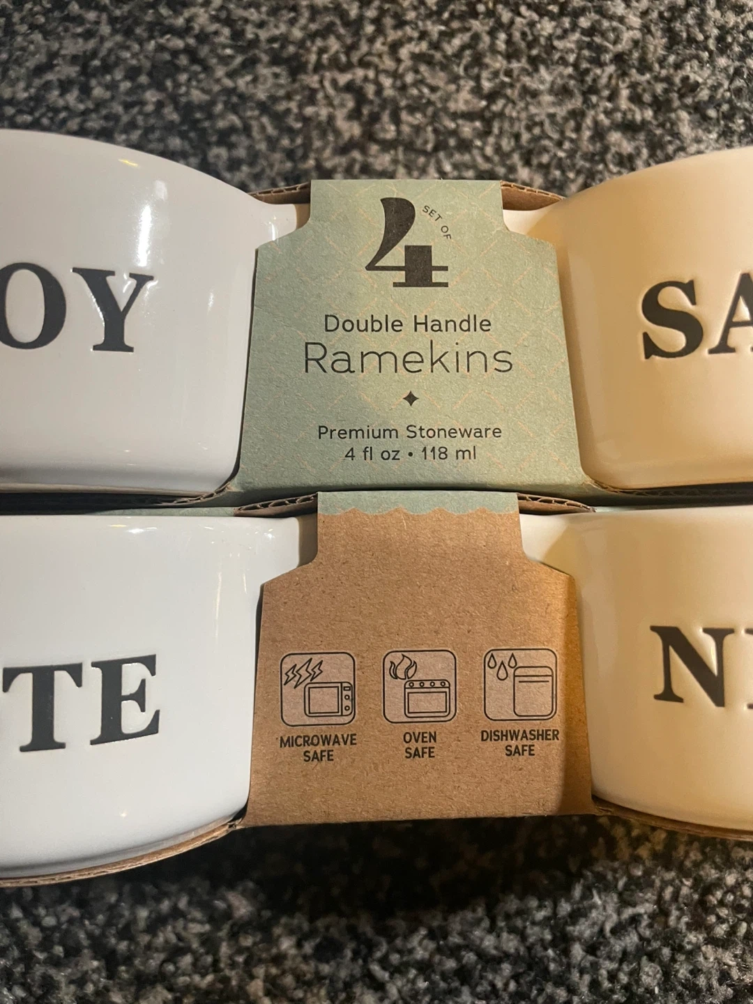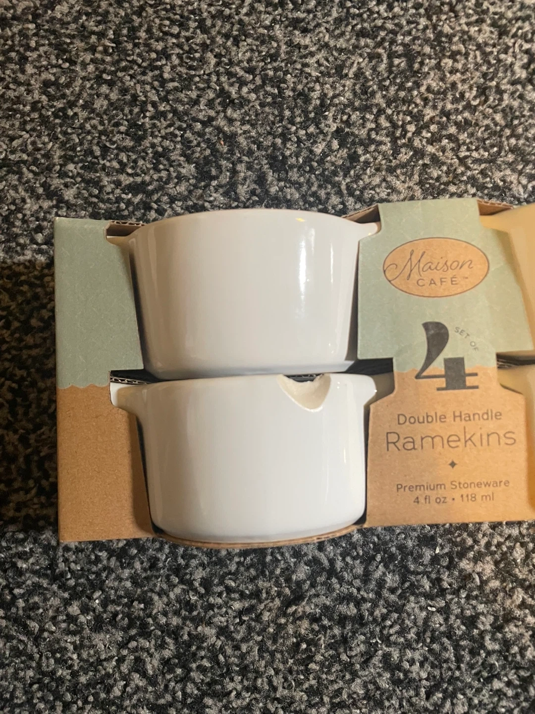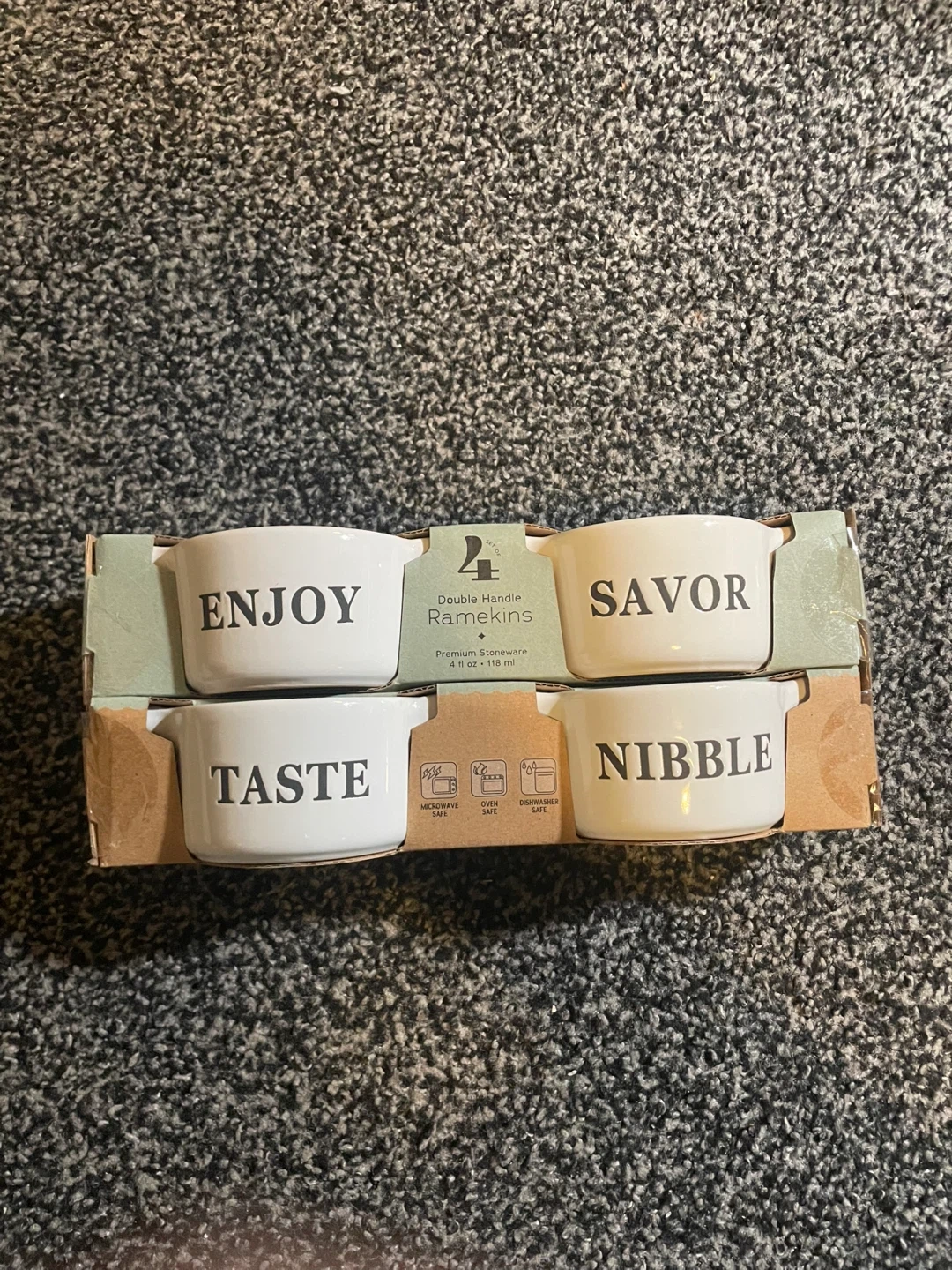 I'm selling a brand new set of 4! They are made of premium stoneware and each holds 4 fl oz (118 ml). They are microwave, oven, and dishwasher safe! Bought it in London drugs for 15 dollars plus tax! Sadly has a small chip at one of the ramekins on the back side!