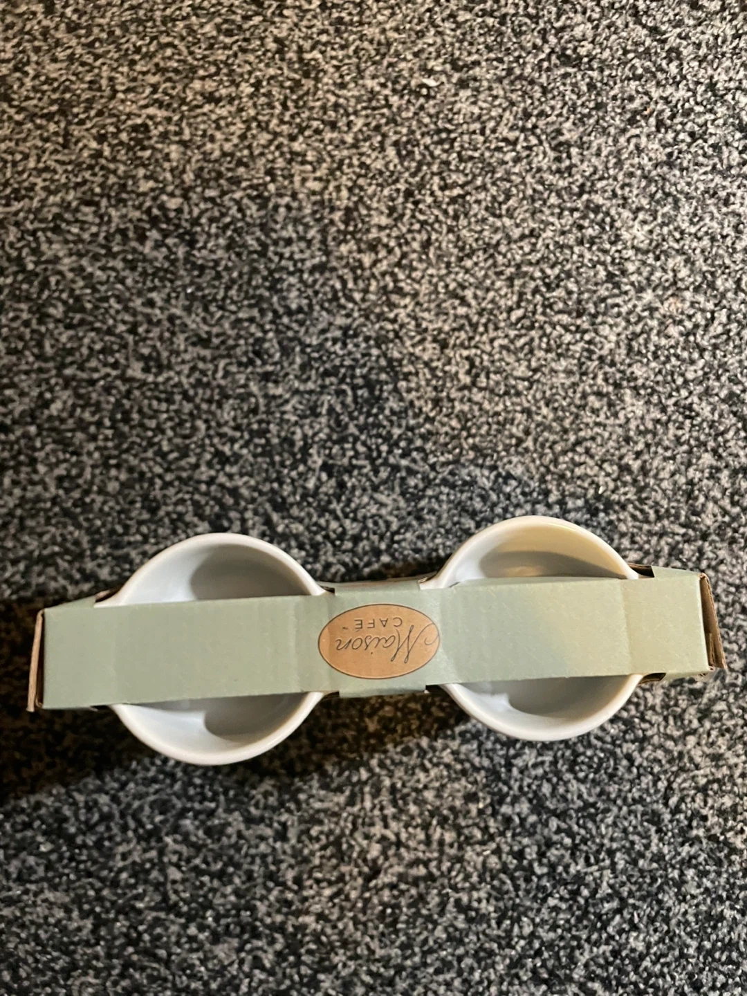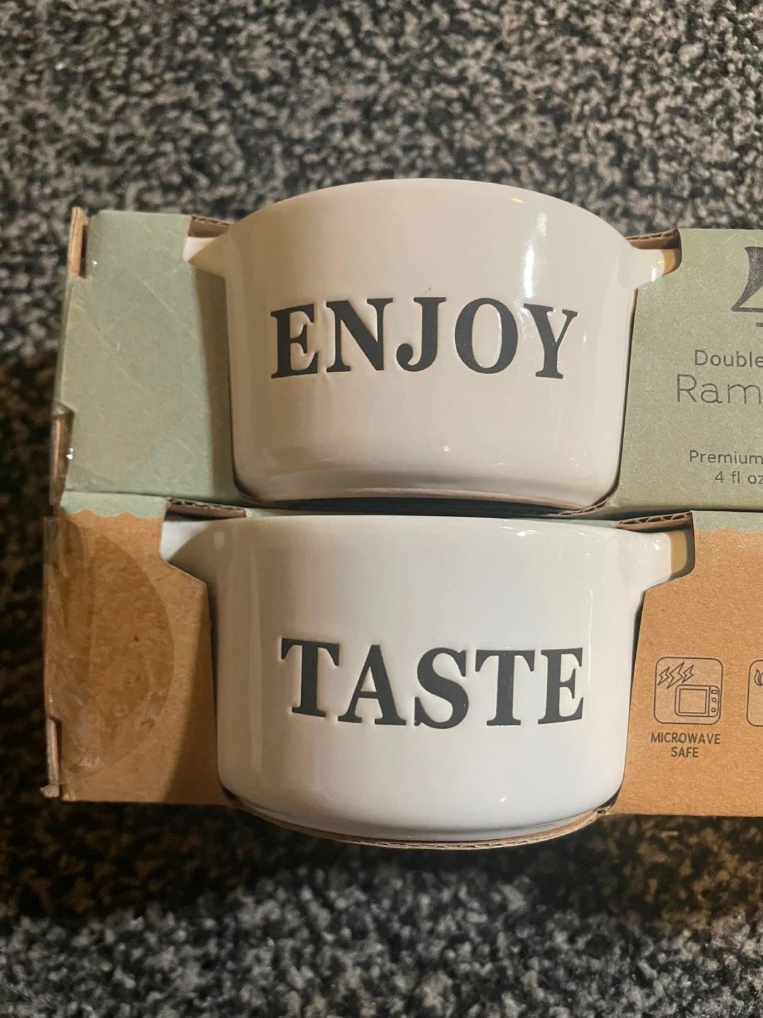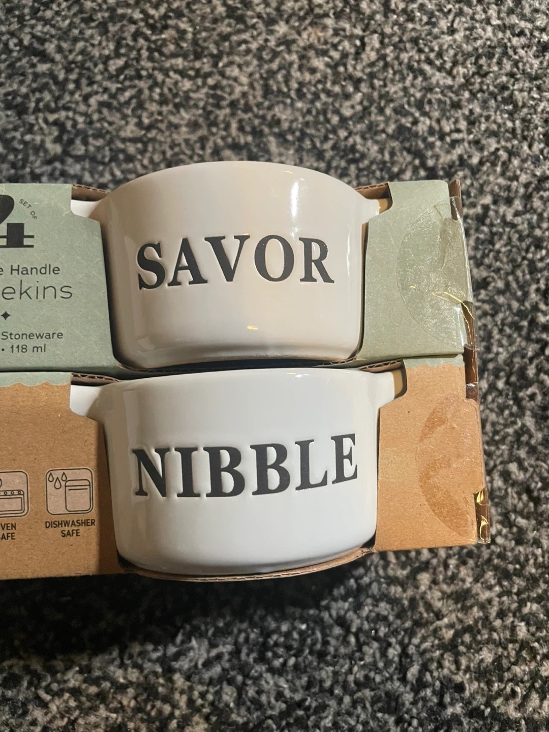 I'm selling a brand new set of 4! They are made of premium stoneware and each holds 4 fl oz (118 ml). They are microwave, oven, and dishwasher safe! Bought it in London drugs for 15 dollars plus tax! Sadly has a small chip at one of the ramekins on the back side!
