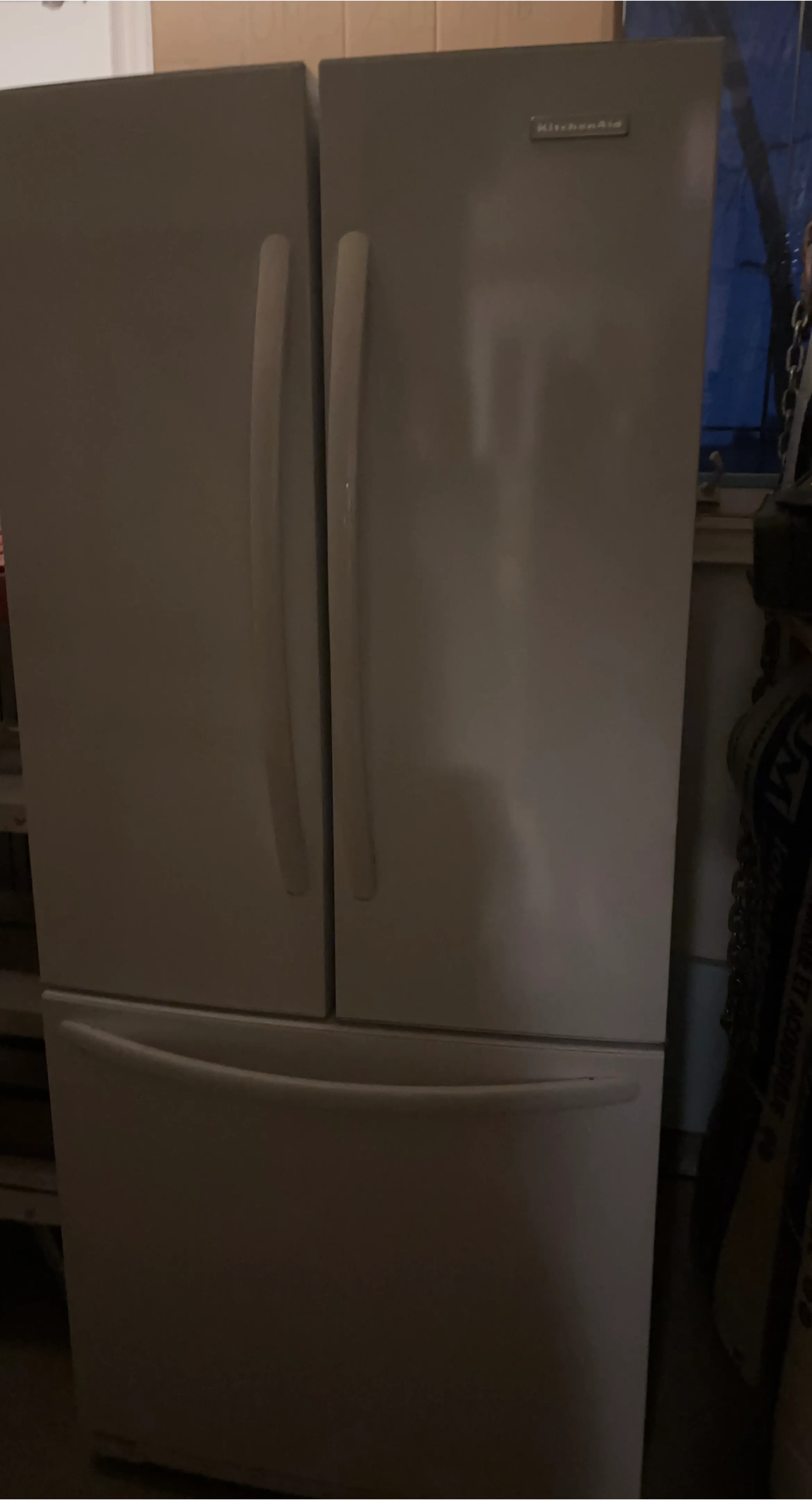 Selling a KitchenAid refrigerator with a French door design. It's in good condition and ready for a new home! It has a bottom freezer drawer and is white in colour.