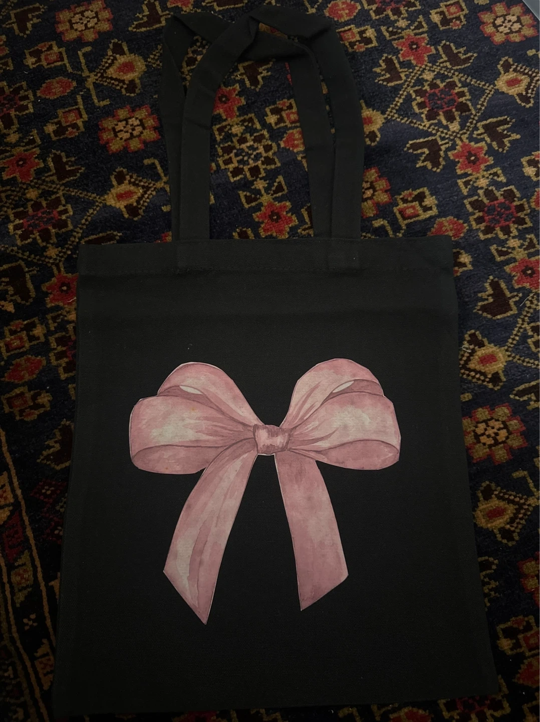 Here's a cute black tote bag! It features a lovely pink bow design. Perfect for carrying your essentials in style