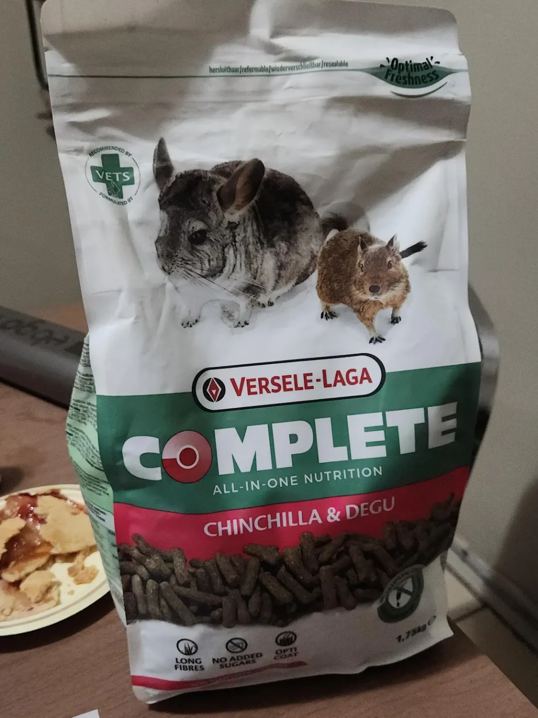 Selling a bag of Versele-Laga Complete All-in-One Nutrition food for chinchillas and degus. It's a complete food with long fibres and no added sugars. Perfect for your little furry friends!