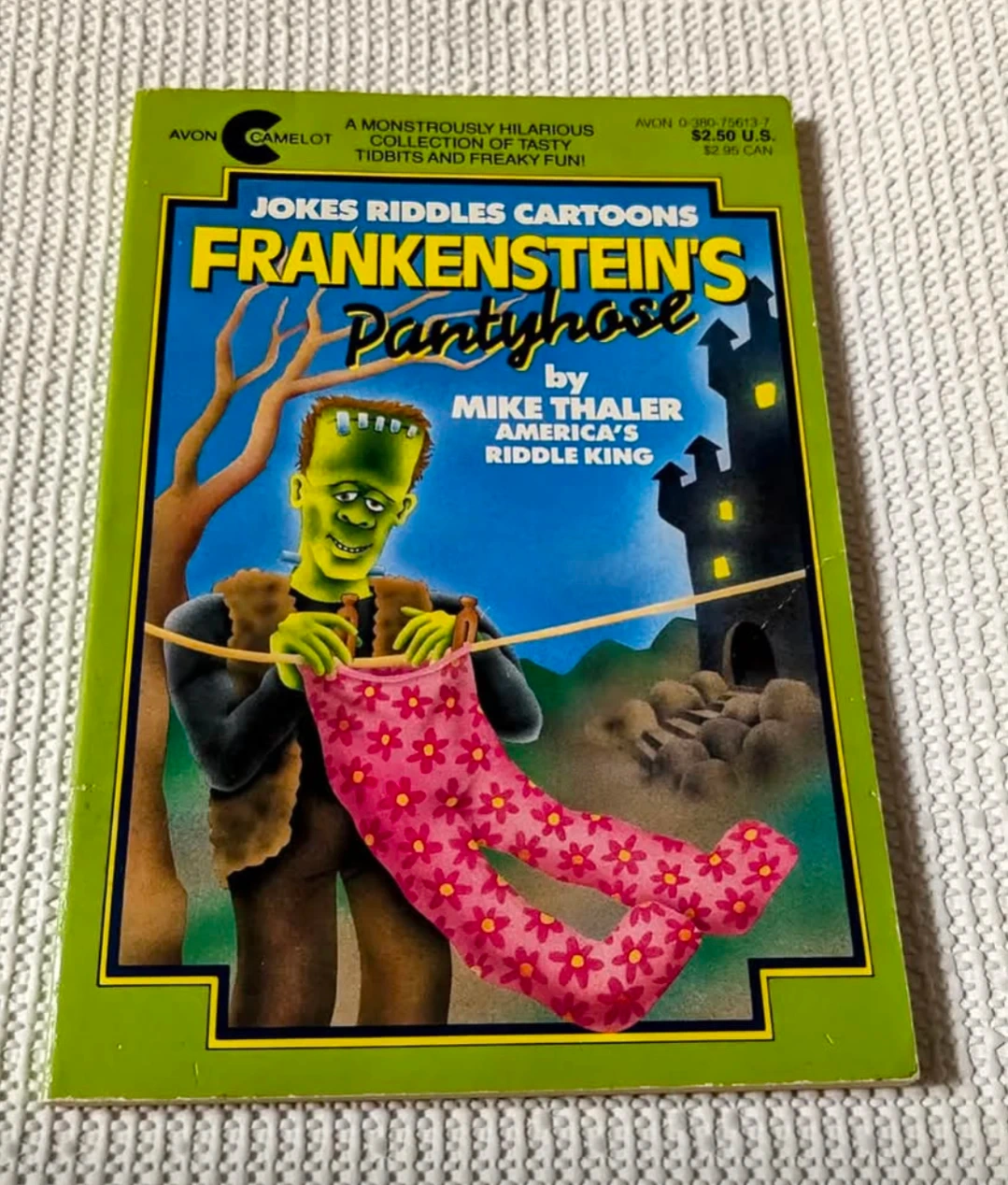Selling "Frankenstein's Pantyhose," a collection of jokes, riddles, and cartoons by Mike Thaler! It's part of the Avon Camelot series and promises a monstrously hilarious read with tasty tidbits and freaky fun!