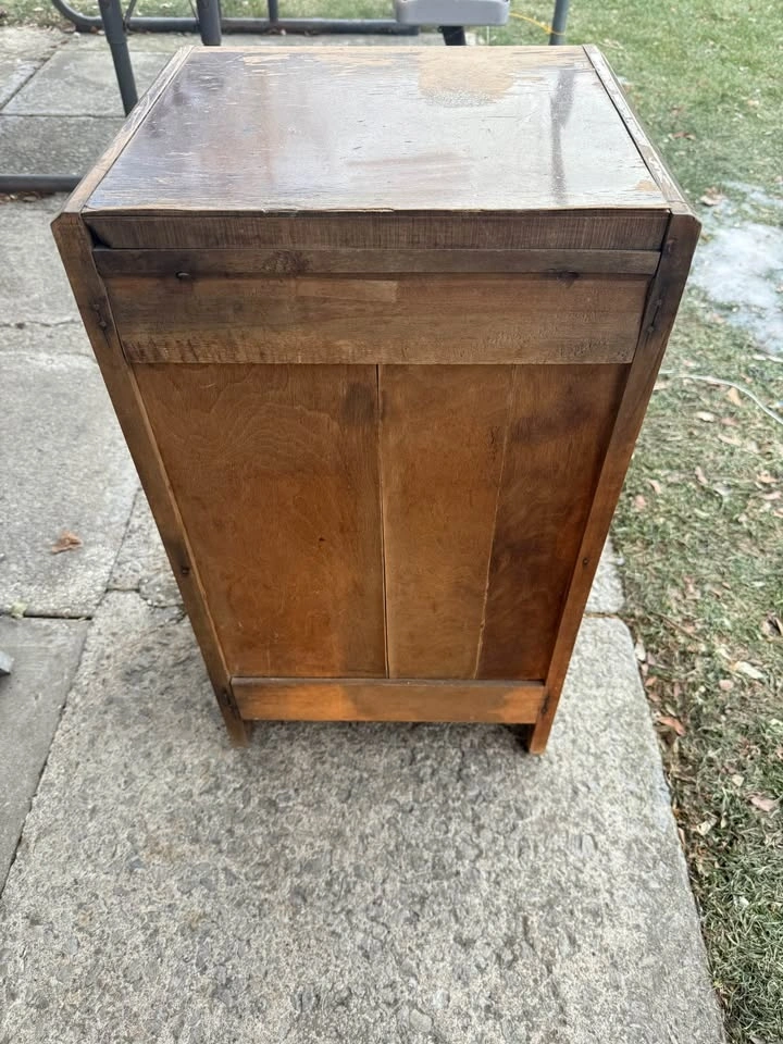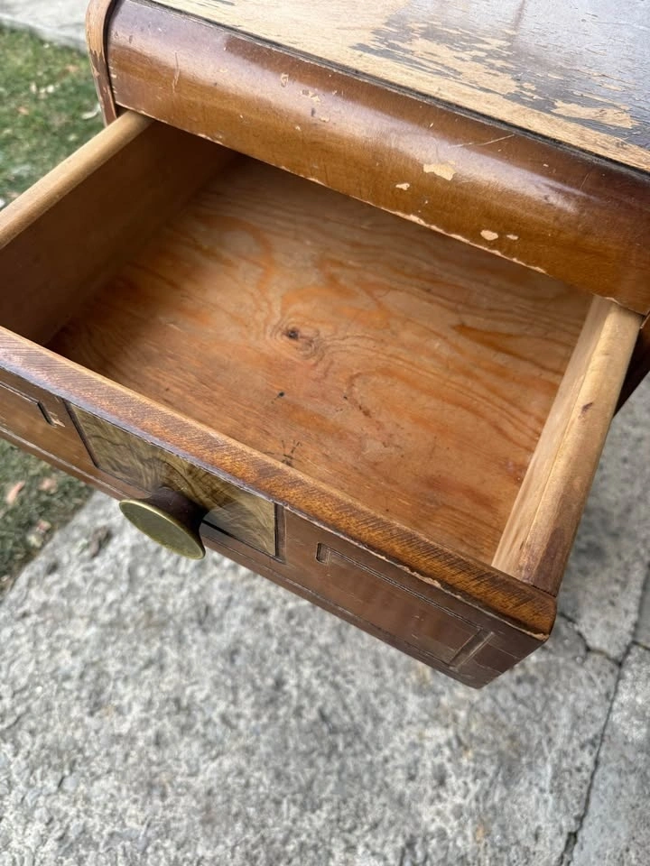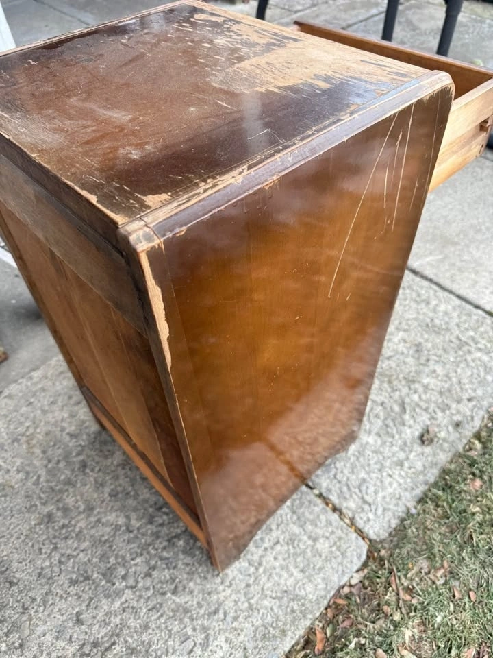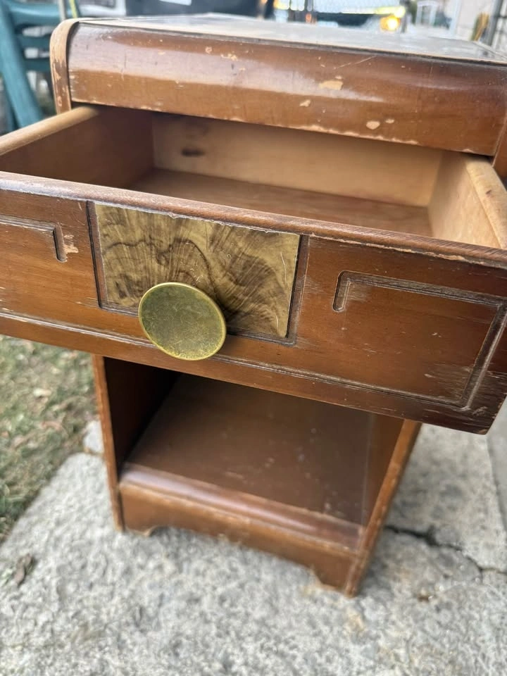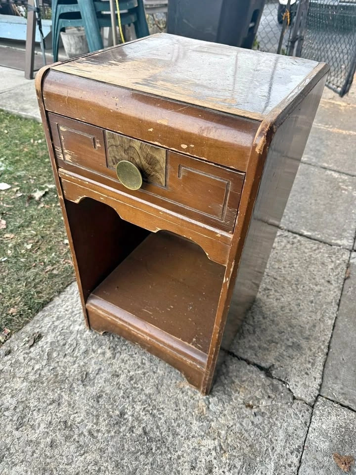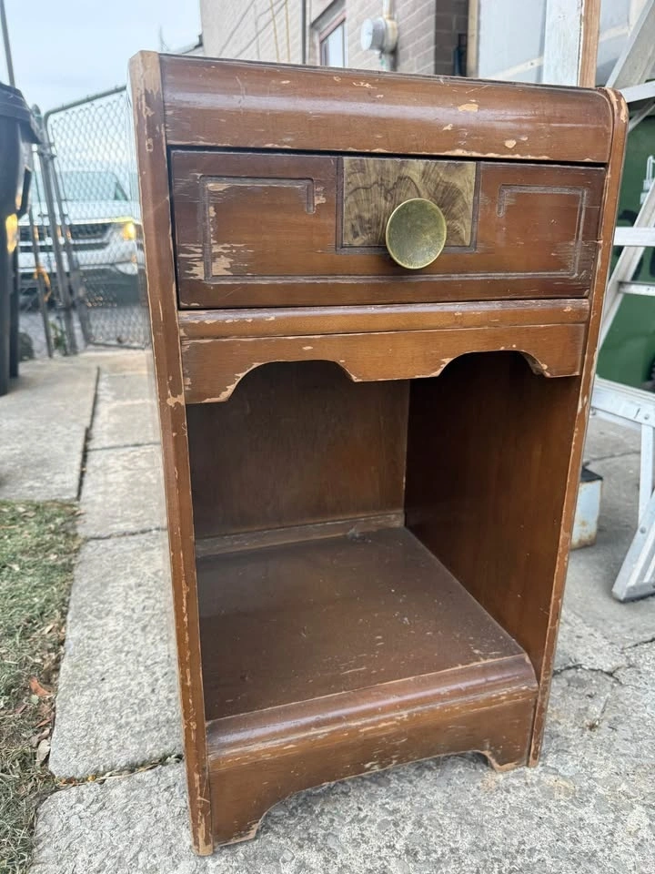 Based on research this nightstand is from the 30s-40s. Overall the condition is intact. We were going to start a DIY refinishing, but I think it’s great for someone else looking for a project. Have seen similar ones range from $200+ , we have a reduced price due to the start of sanding the top.
