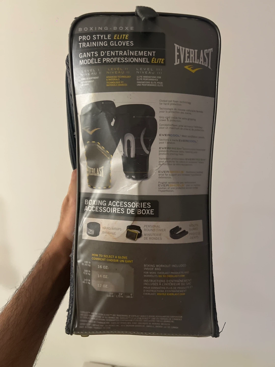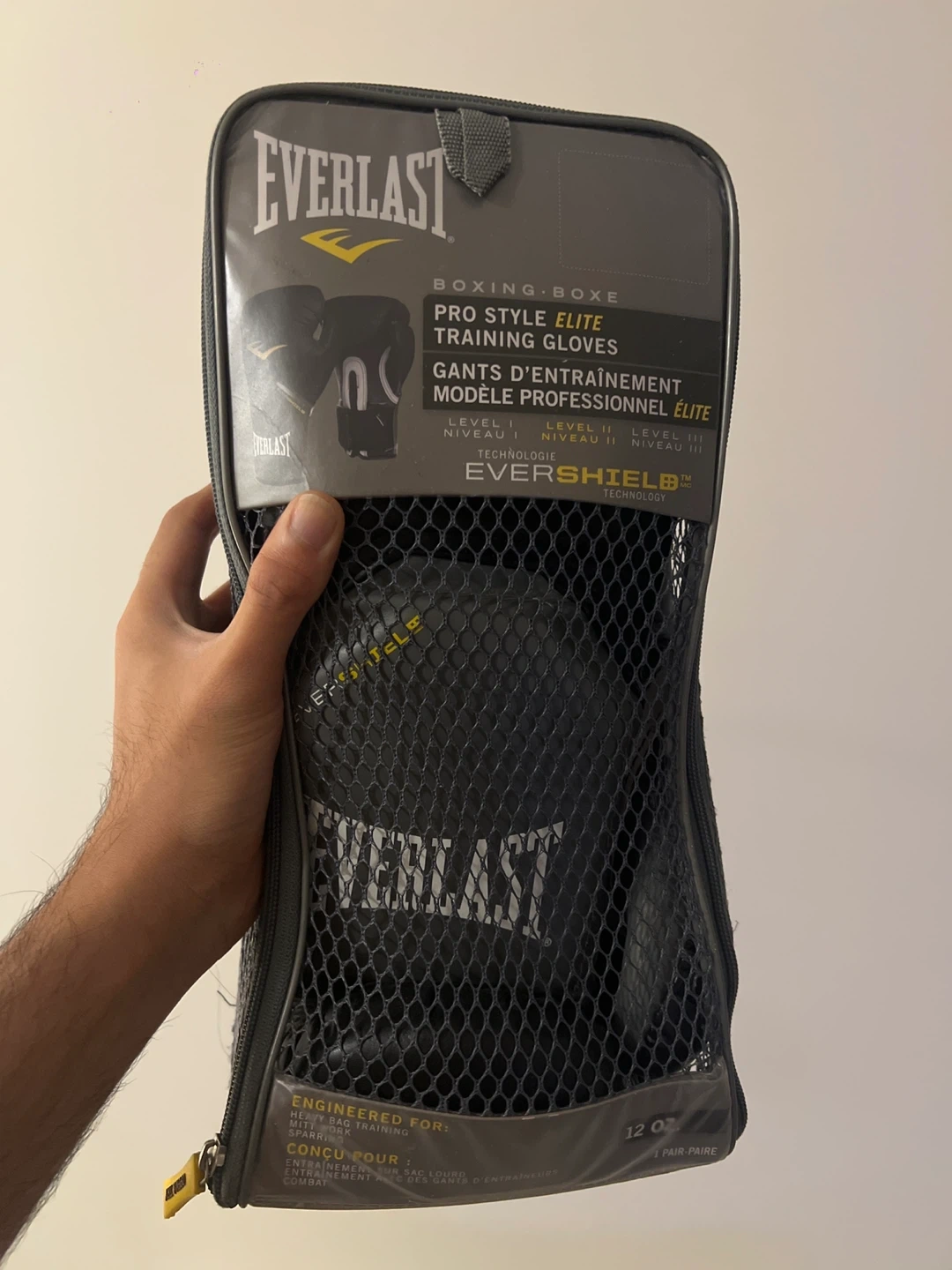 Selling a pair of Everlast Pro Style Elite training gloves in 12 oz size. They come in the original packaging, which includes instructions for boxing workouts. The gloves feature Evercool technology for ventilation, and grip cord inside for extra gripping power. They are designed for heavy bag training and sparring!