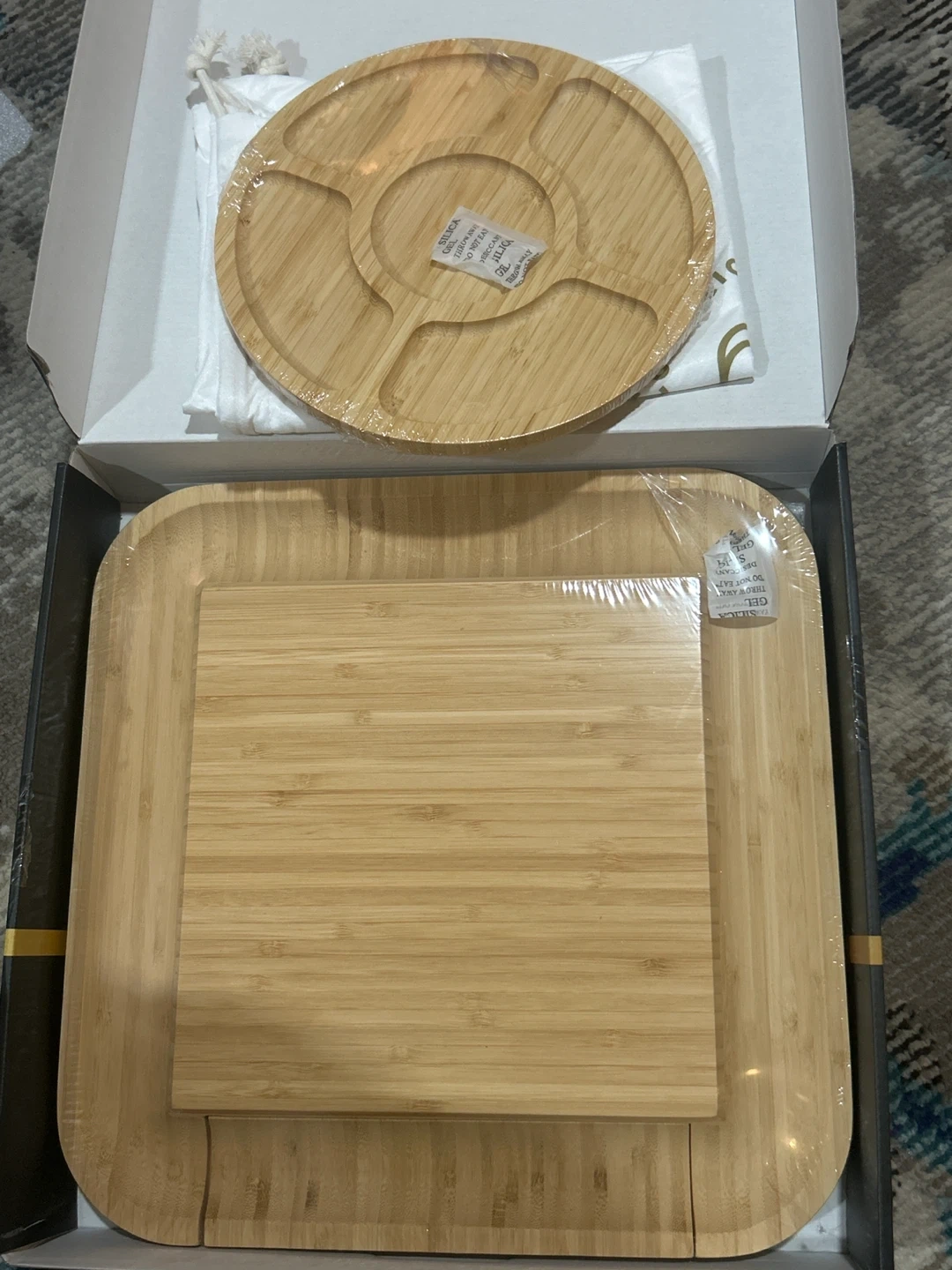 Selling a brand new bamboo serving tray set that's still in its original box! It includes a round tray with compartments and a square tray. Perfect for serving snacks or appetizers at your next gathering. The set is made of natural bamboo, adding a touch of elegance to any table setting