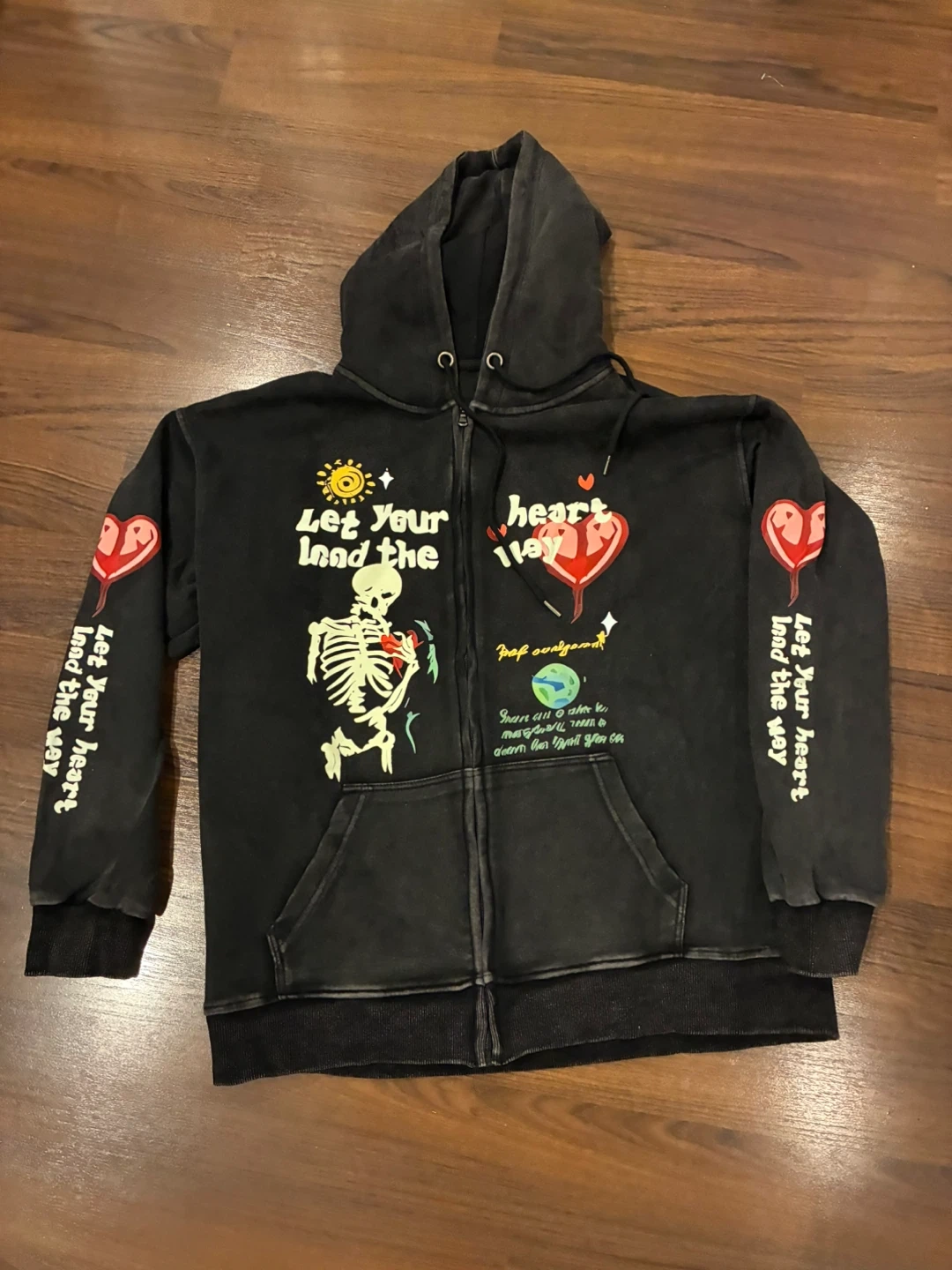 Selling a black zip-up hoodie with unique graphic prints! It features a skeleton, hearts, and text designs. The hoodie has a worn look, giving it a cool, vintage vibe. Perfect for adding some edge to your wardrobe! Brand new & price is firm. Men’s medium.