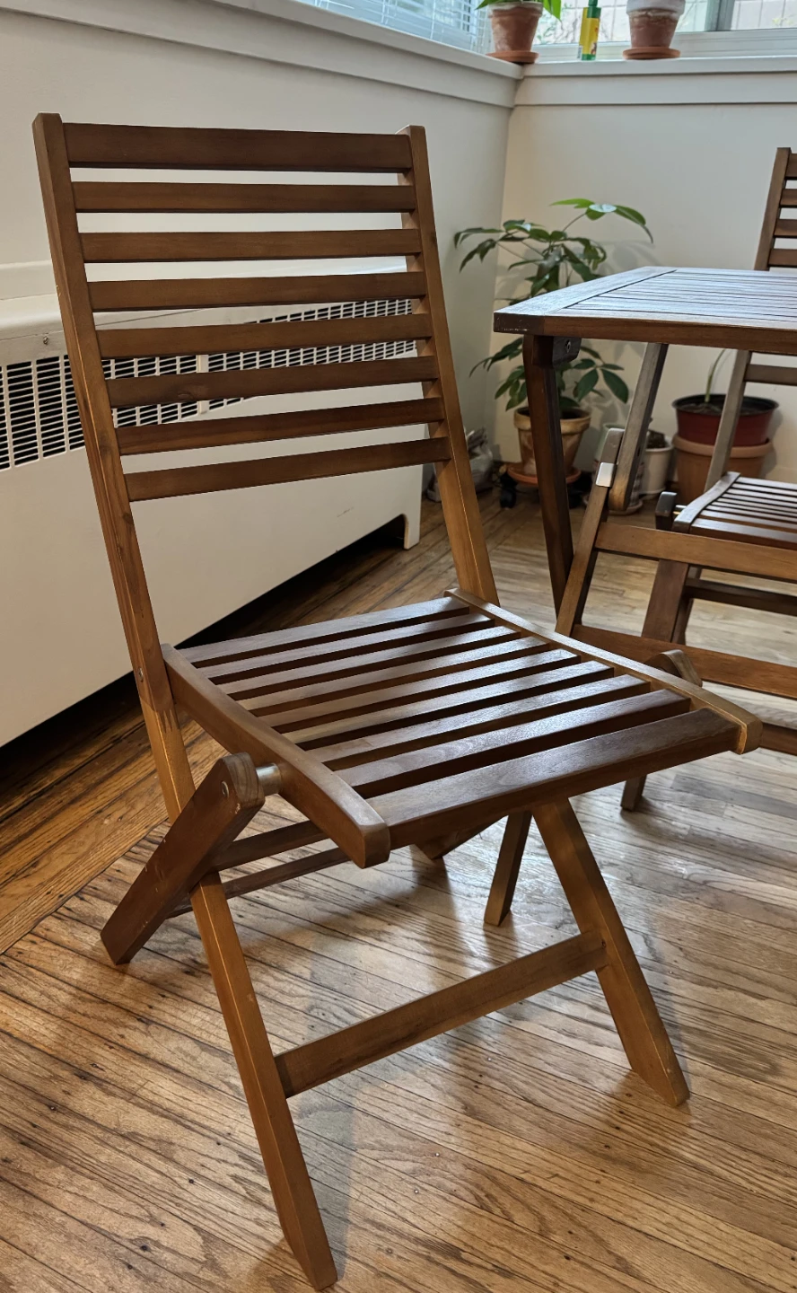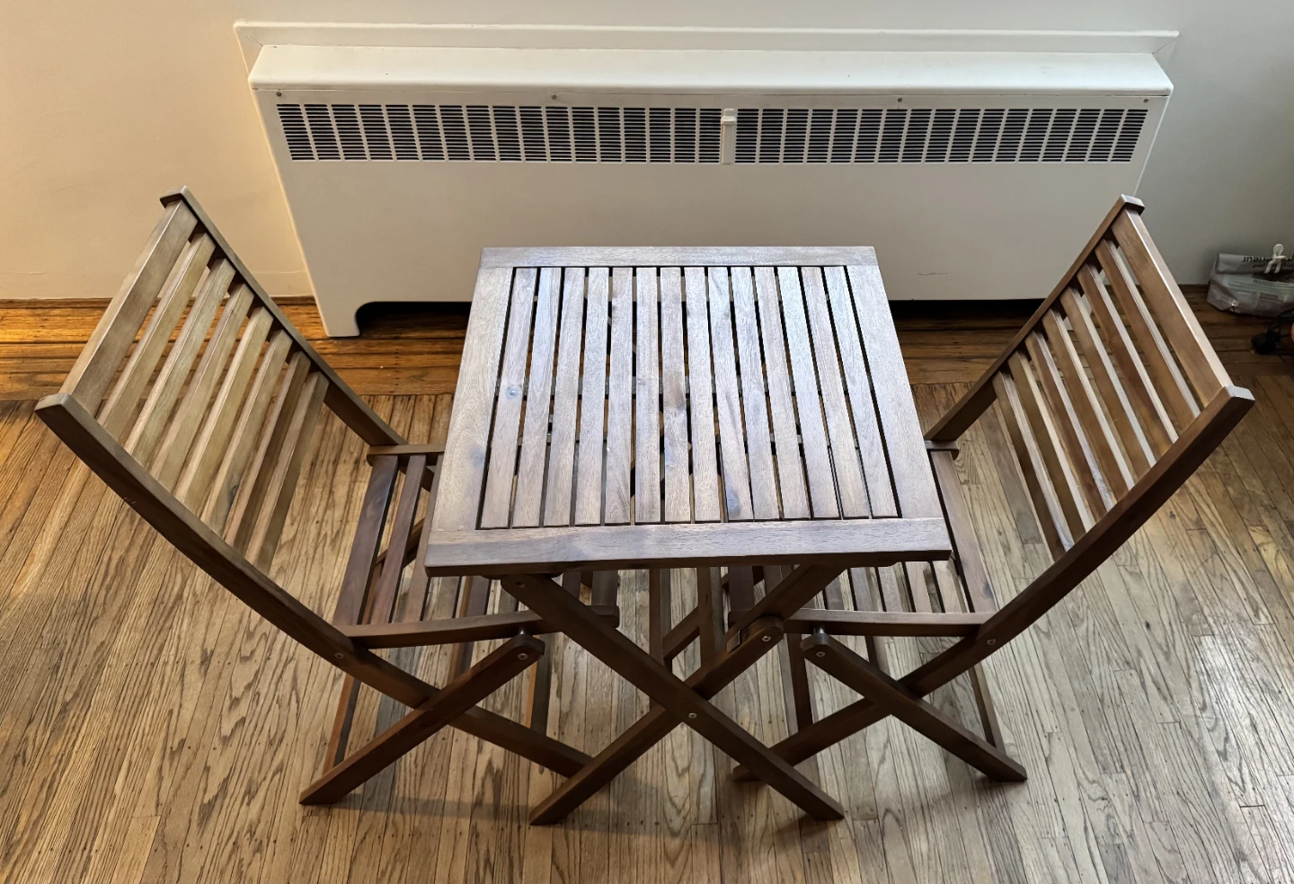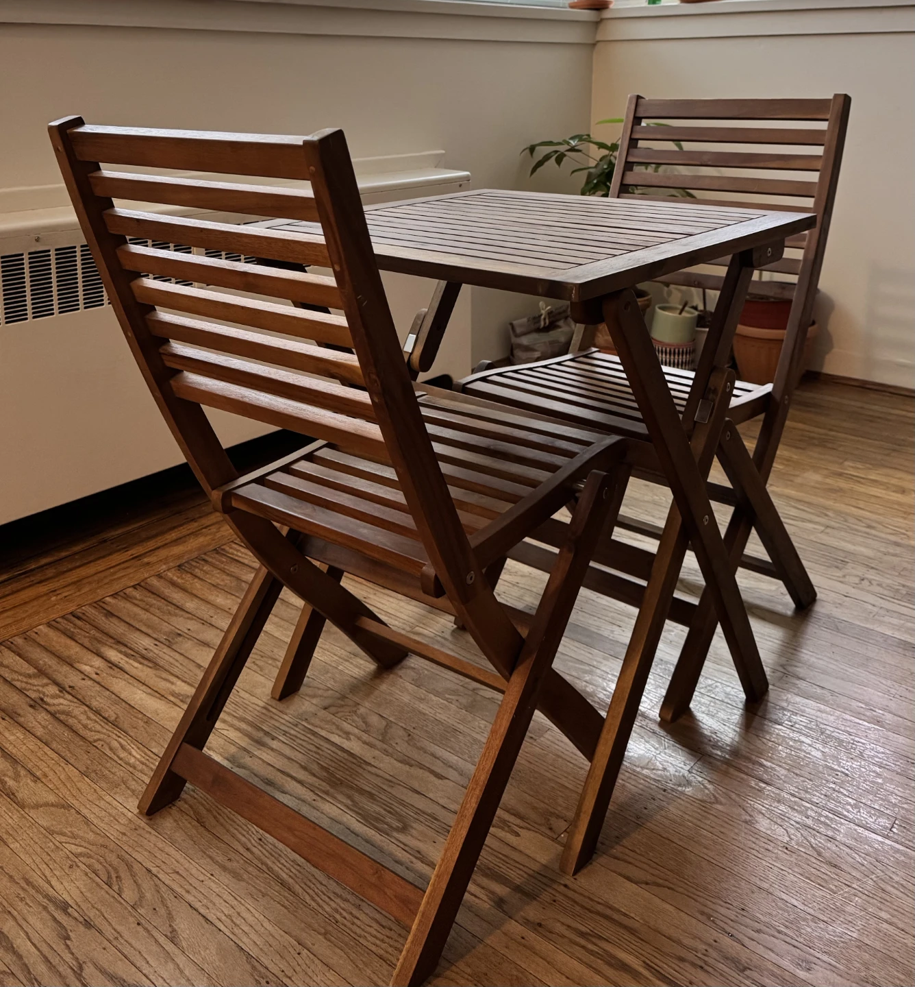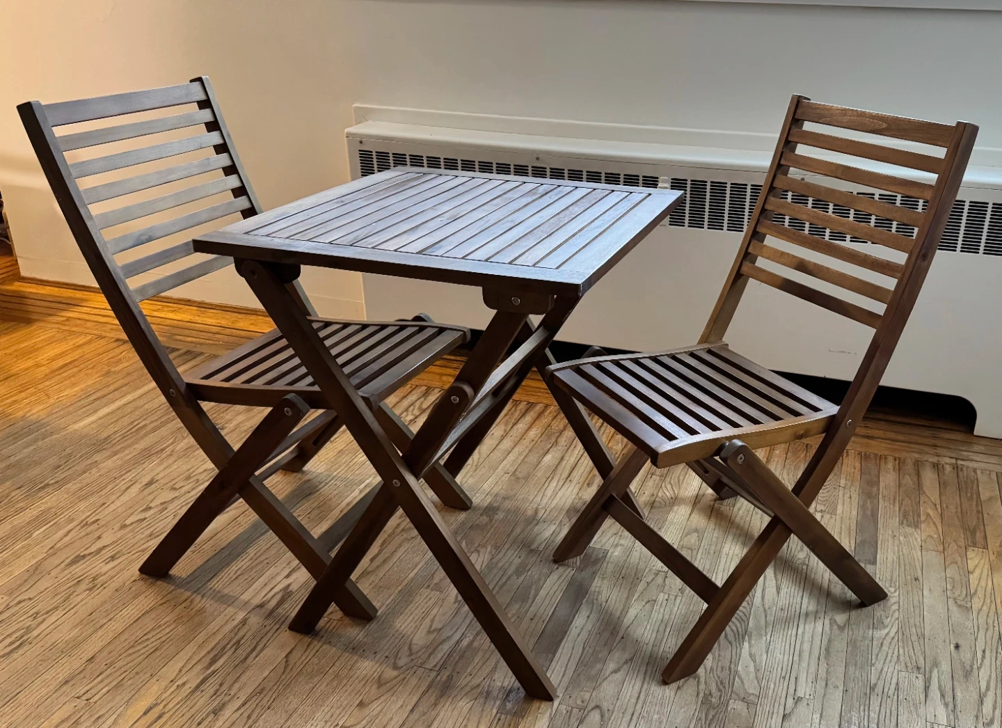 Selling an outdoor folding table with two folding chairs. Great for a small balcony or patio! The set is in good condition and ready for a new home.