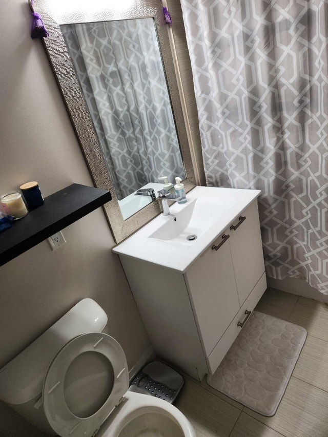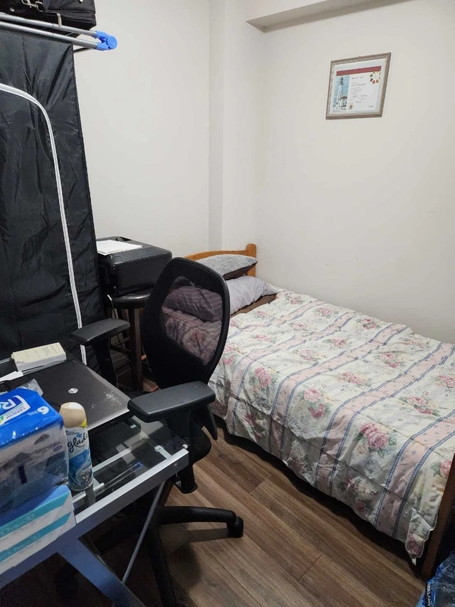 One furnished bedroom for rent in a two bedroom condo. (Twin bed, desk and wardrobe) Own full bathroom. Share only kitchen. Free access to gyms laundry and wifi. Available February 1. Student or single working adult only. Non smoker. No parking available..