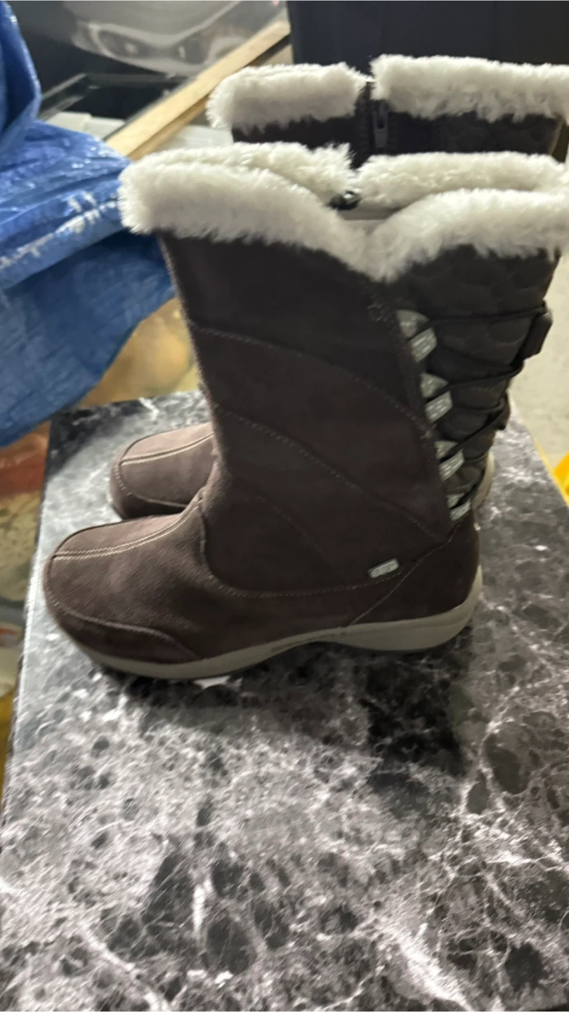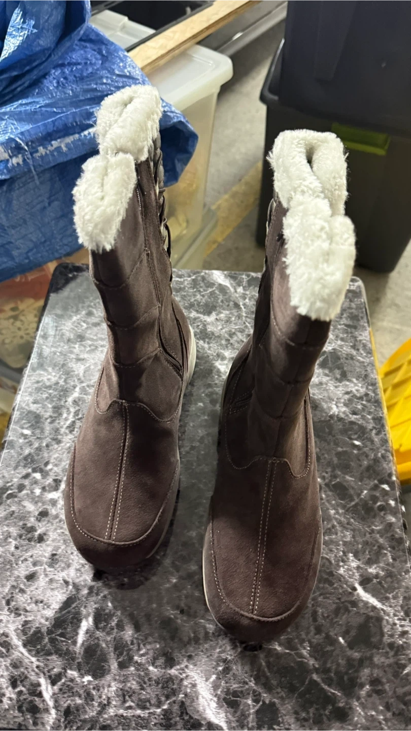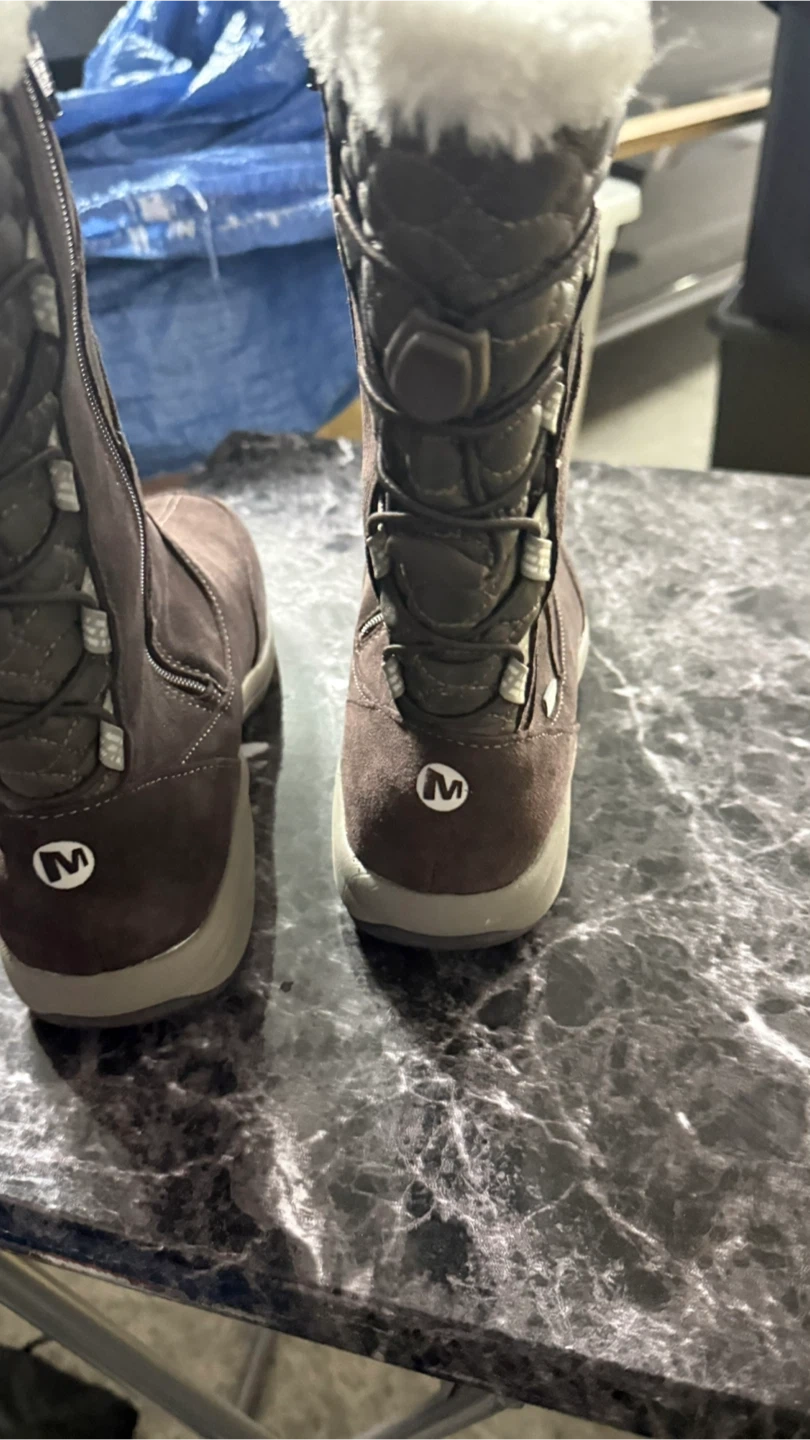 These Merrell winter boots are perfect for keeping your feet warm and cozy! They are brown with a faux fur trim. Great for cold weather!