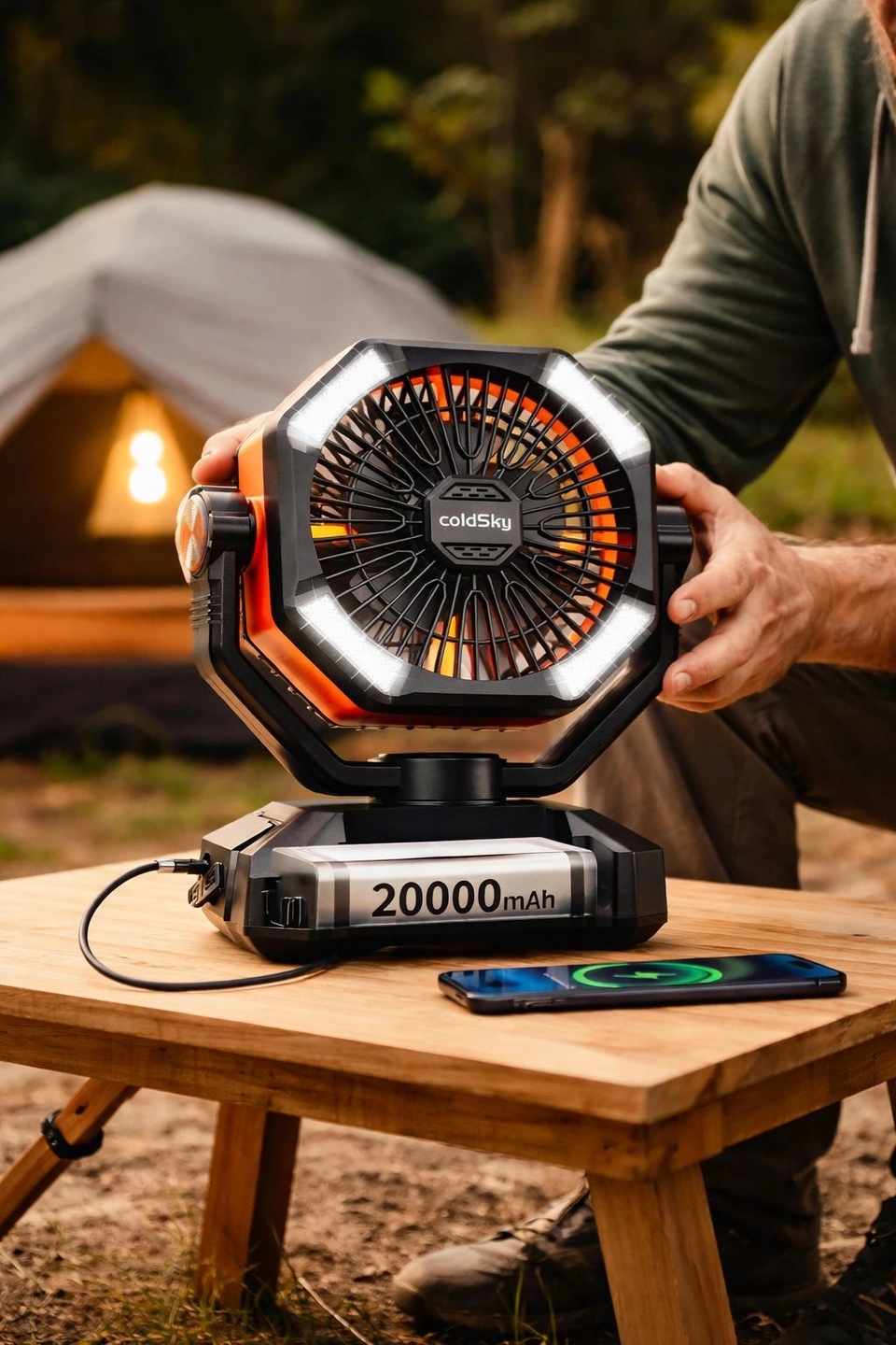 High-power portable camping fan with 20,000mAh rechargeable battery, perfect for camping, emergencies, power outages, travel, or home use. Features strong airflow with multiple speed settings and built-in LED lighting.