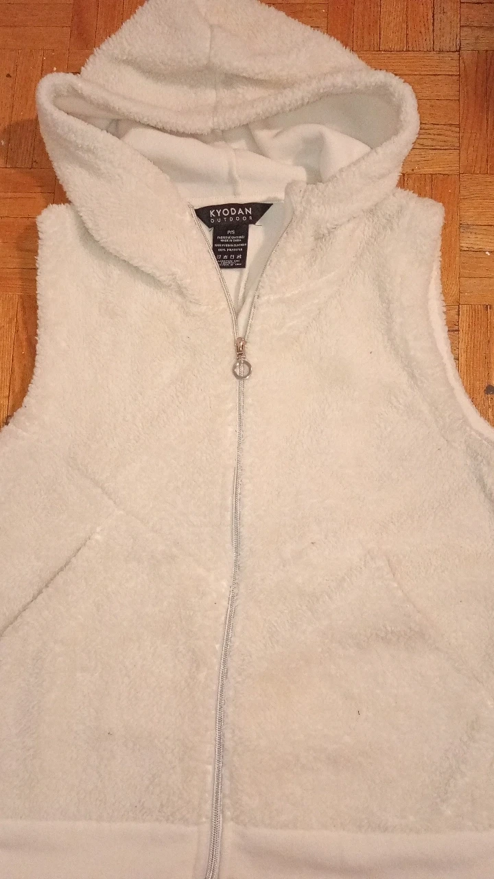 Here's a cozy white hooded vest from Kyodan Outdoor! It's a size P/S and made of 100% polyester. Perfect for layering on those chilly days!