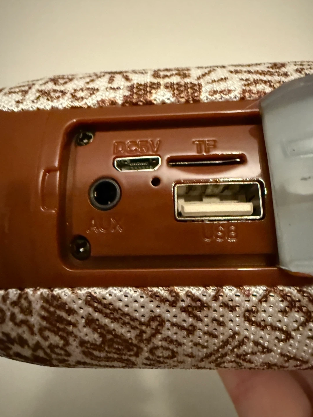 New in box but no charging cord, takes a USB plug (see third photo with all inputs).