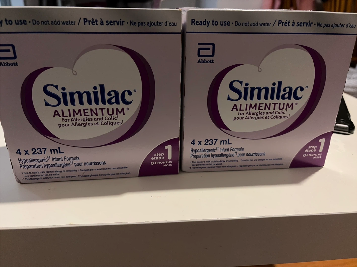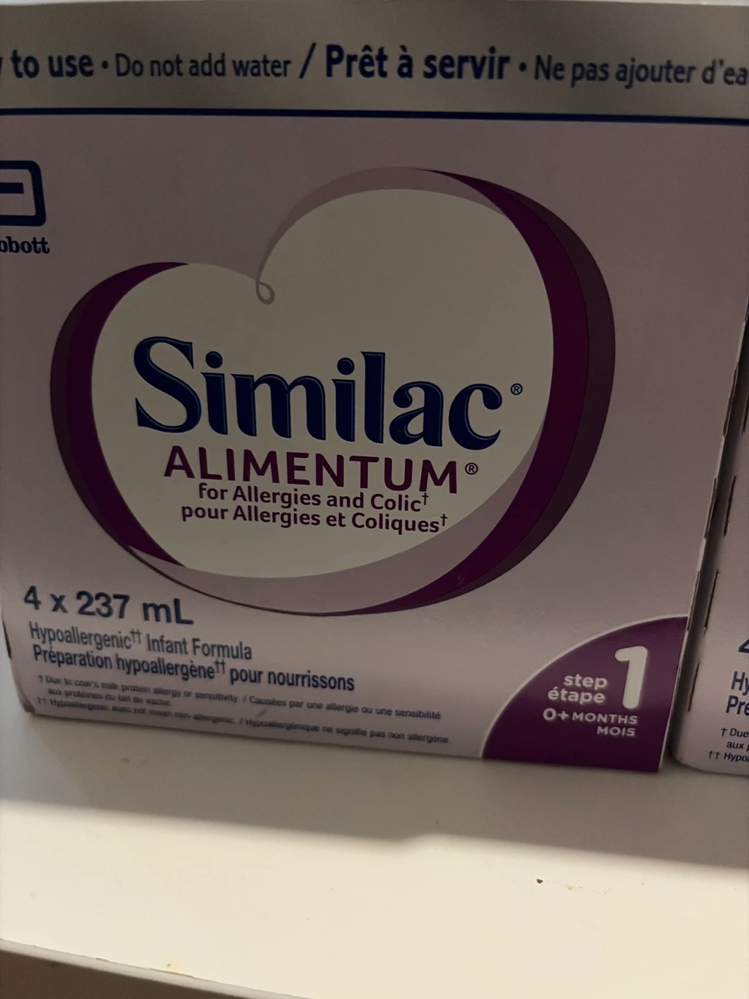 Selling Similac Alimentum infant formula. It is hypoallergenic and for allergies and colic. Each box contains 4 x 237 mL bottles. Suitable for babies 0+ months