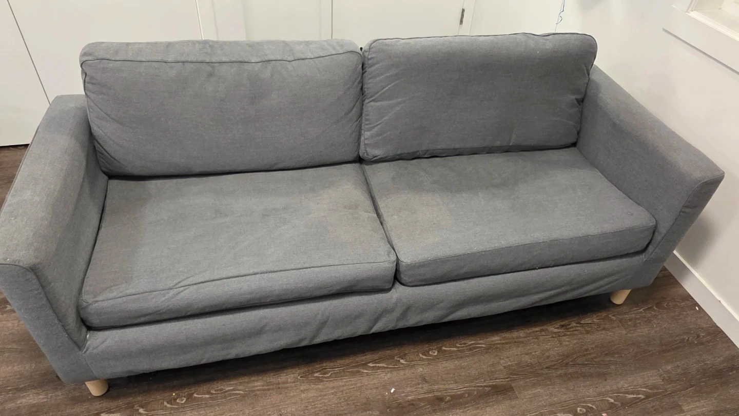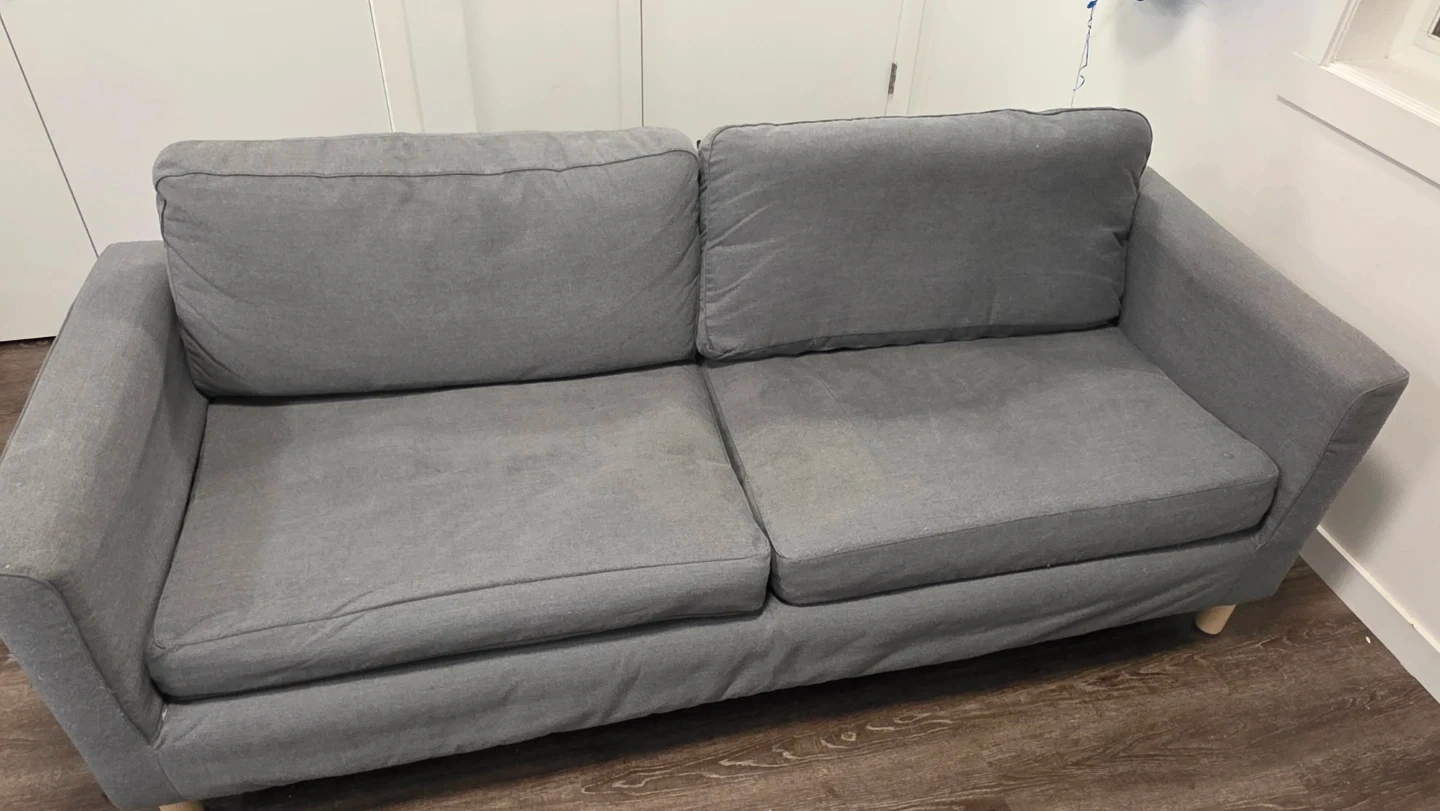 Selling a comfy grey two-seater sofa! It's perfect for a small space or apartment. It has a classic design and is in good condition for everyday use. Please take a look at the pictures for details!