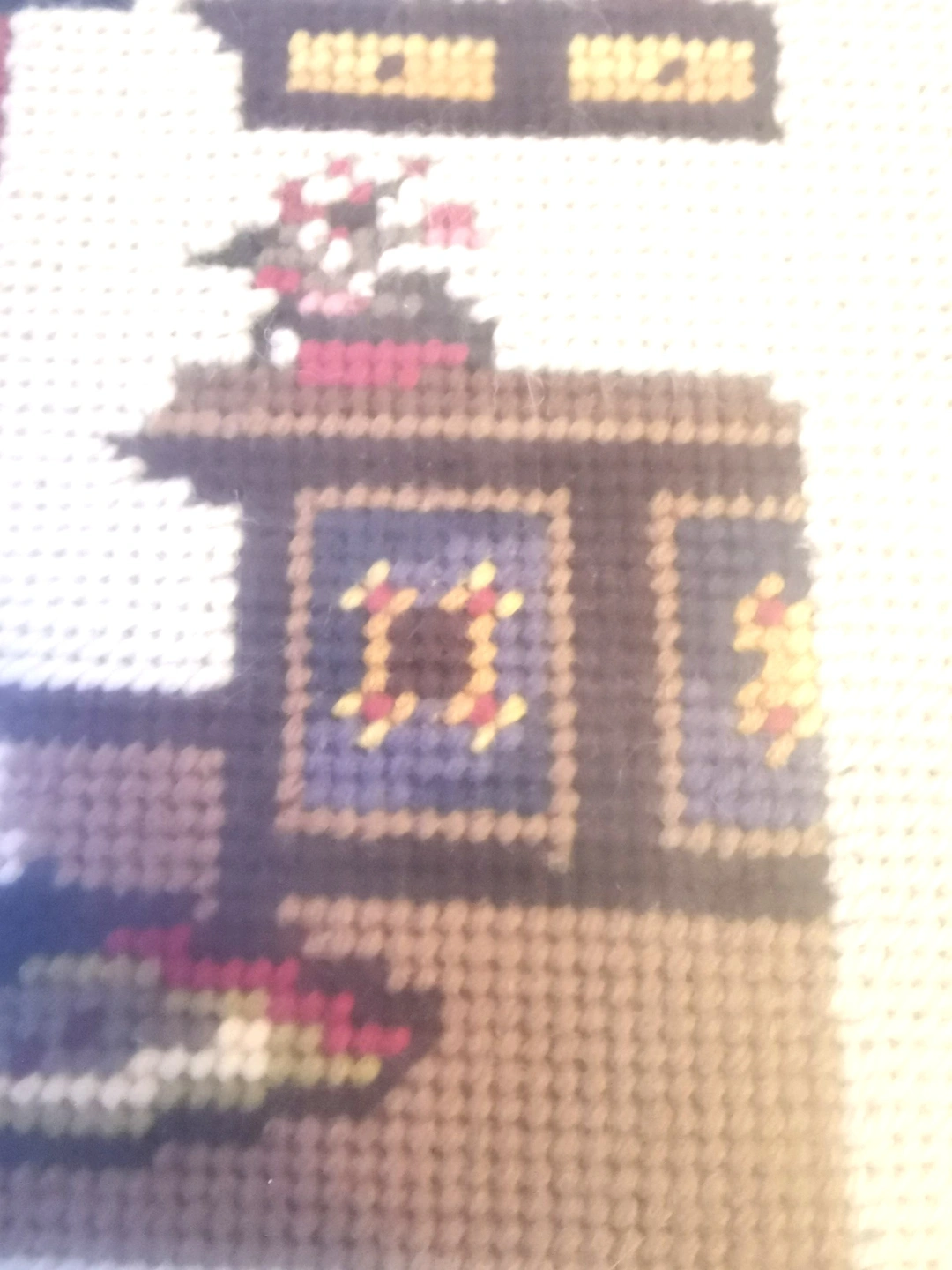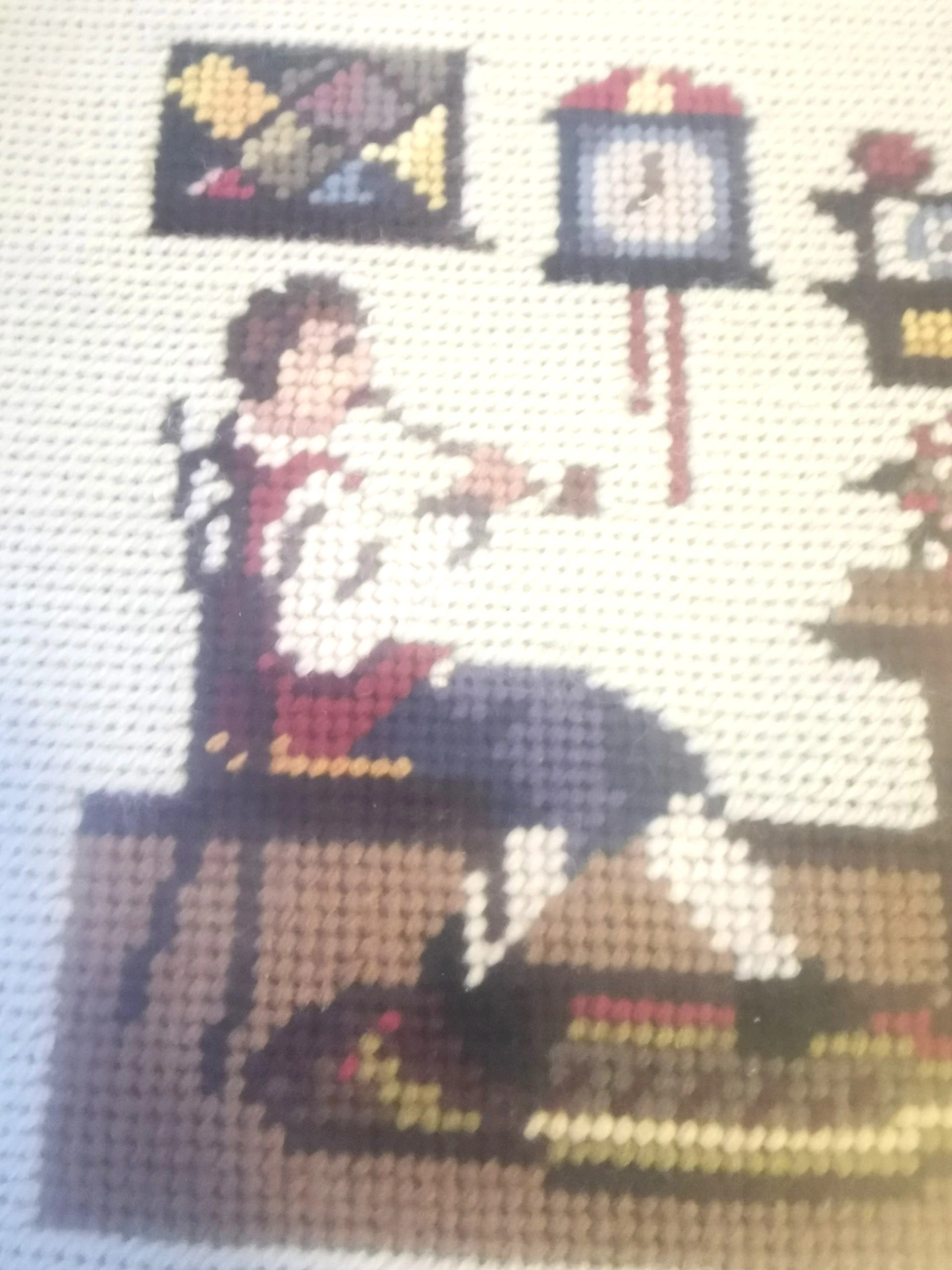 Add a touch of rustic charm to your home with this beautiful pair of handmade needlepoints. These pieces feature classic Colonial-era scenes: a gentleman enjoying a pipe at his desk and a woman working at a traditional spinning wheel.