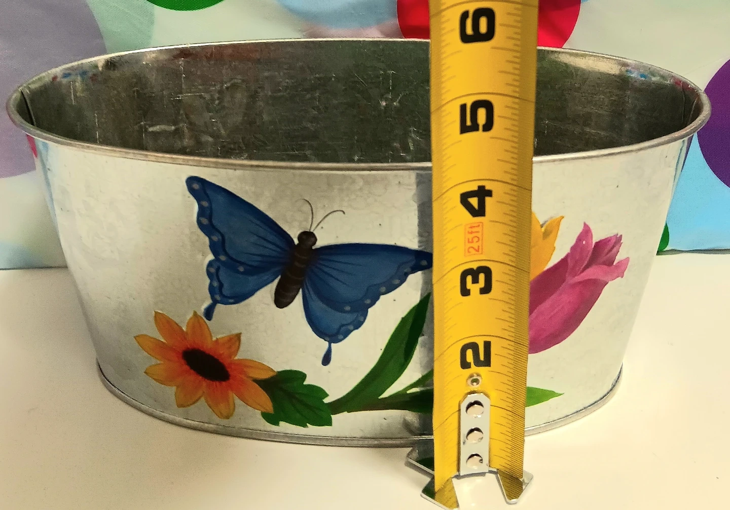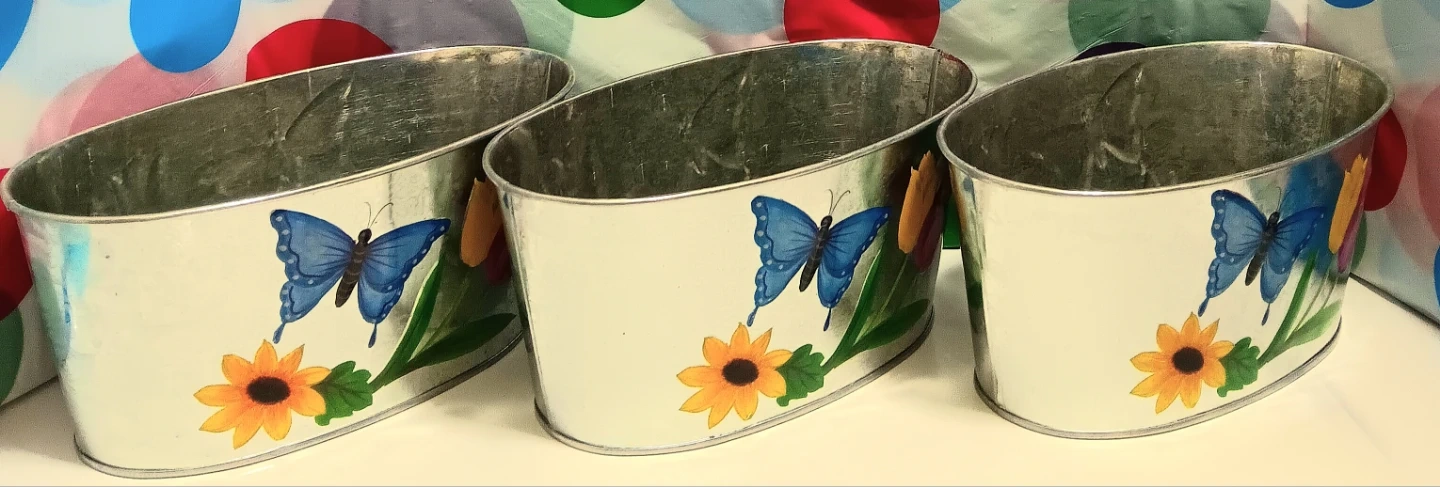 These are decorated metal planters featuring a colourful butterfly and flower motif. They are in used condition and perfect for adding a touch of whimsy to your garden or home decor.