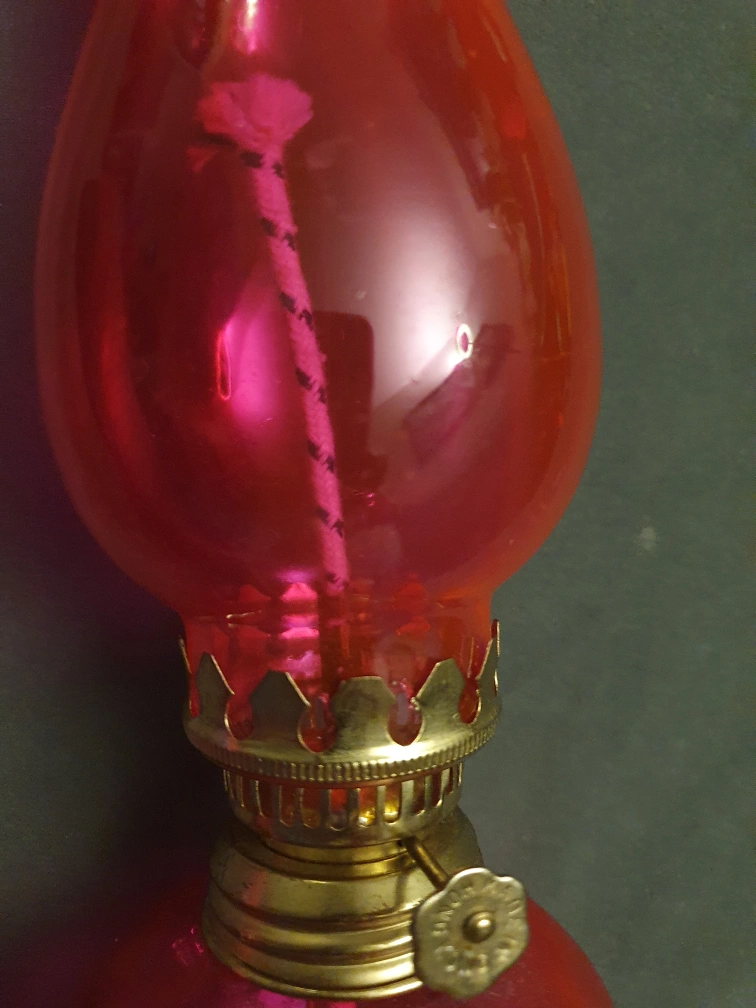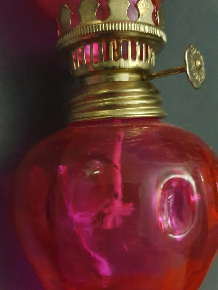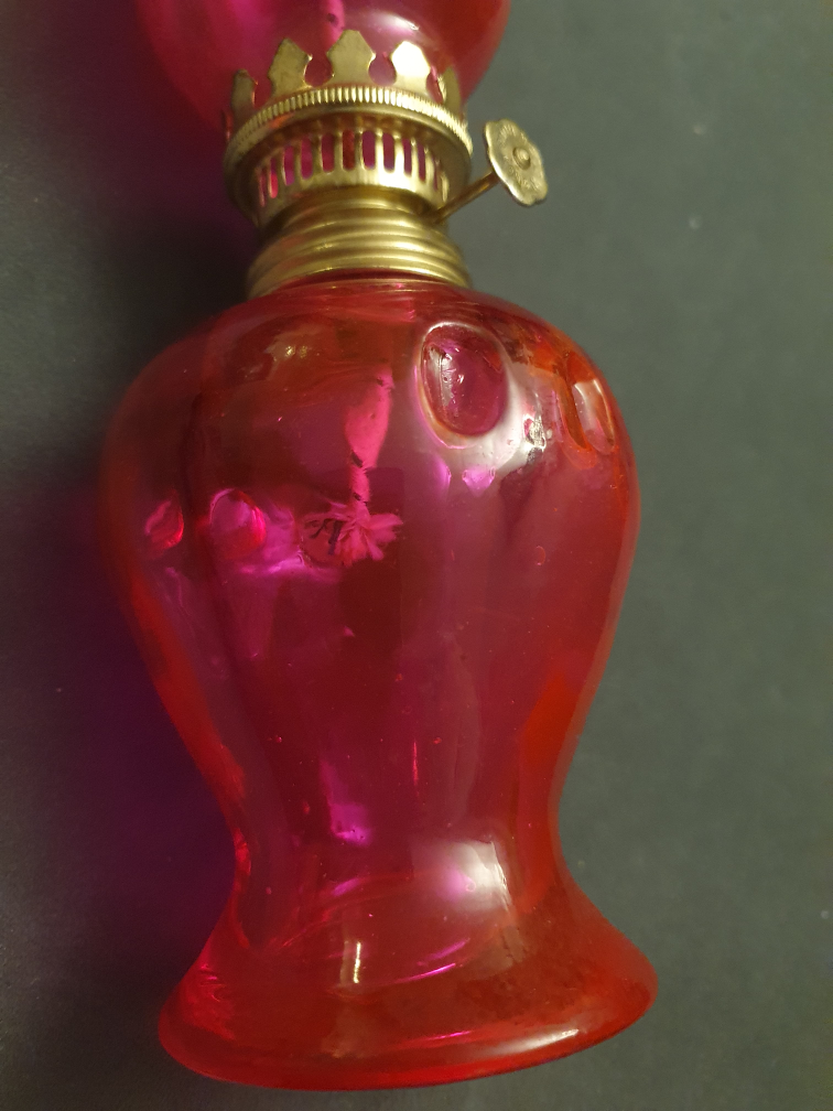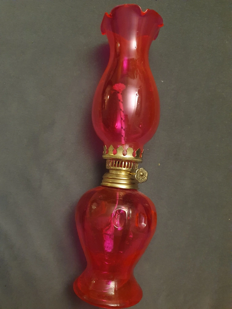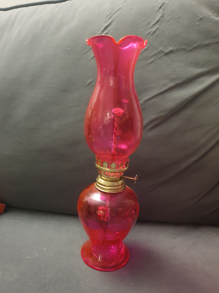 Selling a beautiful red glass oil lamp. It's in good condition and would make a lovely addition to any room! The lamp has a classic design with a brass burner and a clear glass chimney.