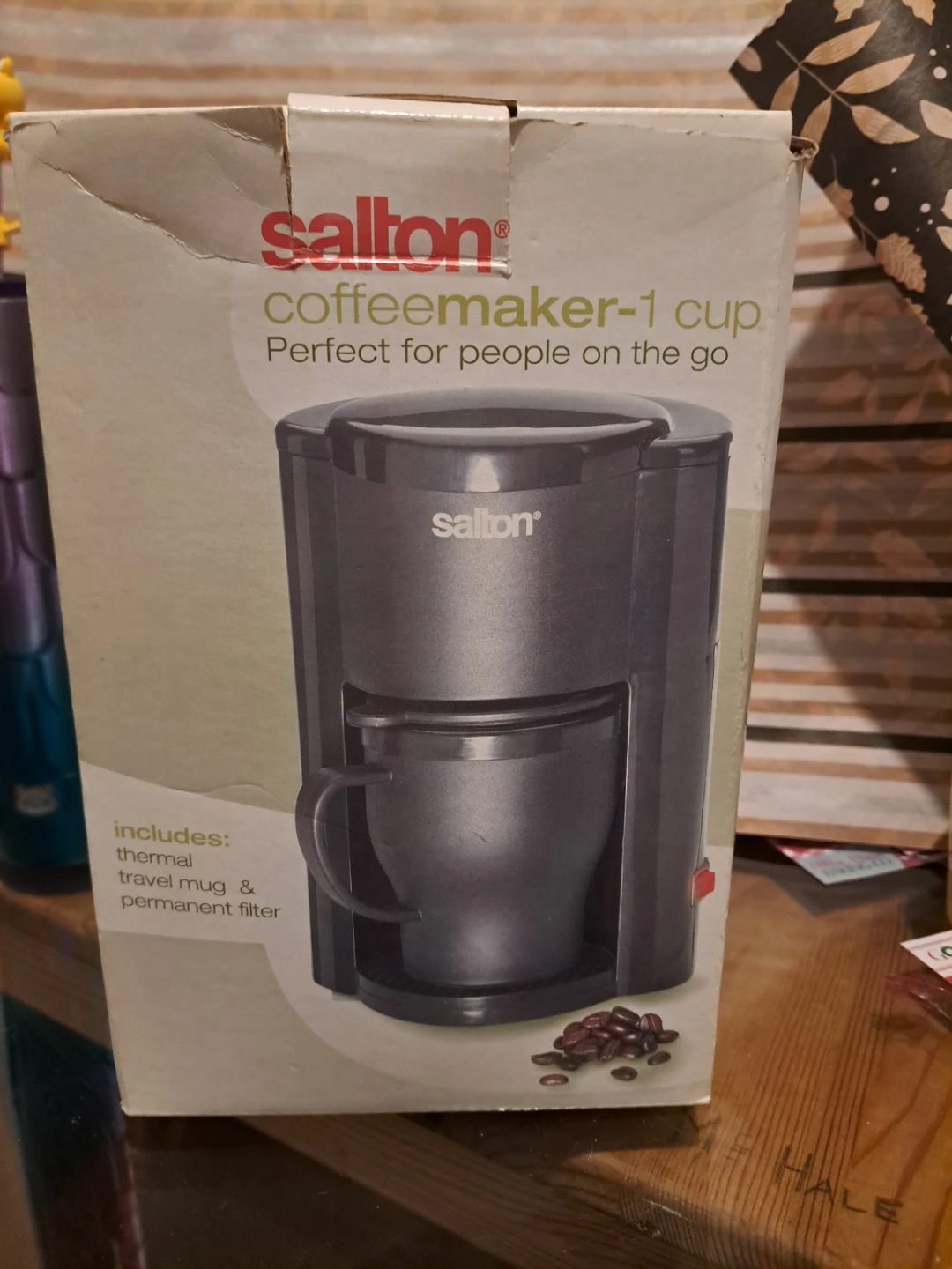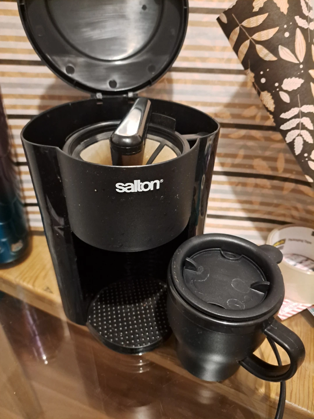 One cup coffee machine with reusable coffee filter, and travel mug.