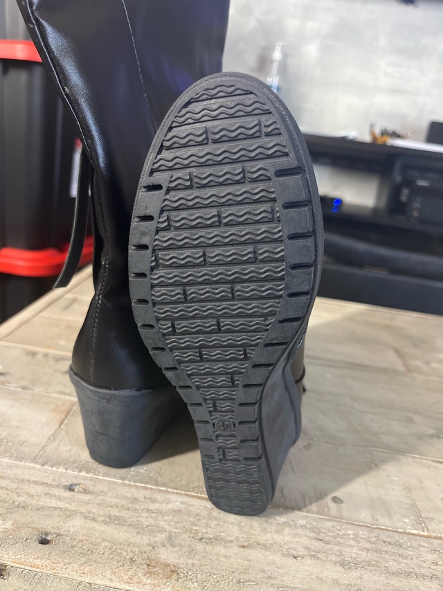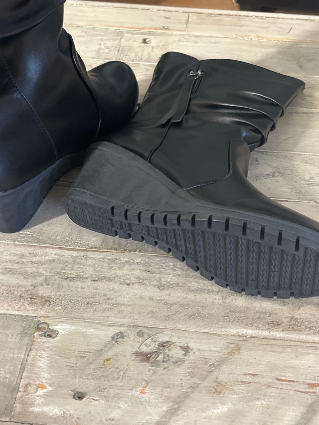 Step out in style with these black wedge heel boots in size 9. These boots feature a sleek design with a comfortable wedge heel, perfect for adding a touch of elegance to any outfit. These are brand new boots. If the ad is up, they're still available!