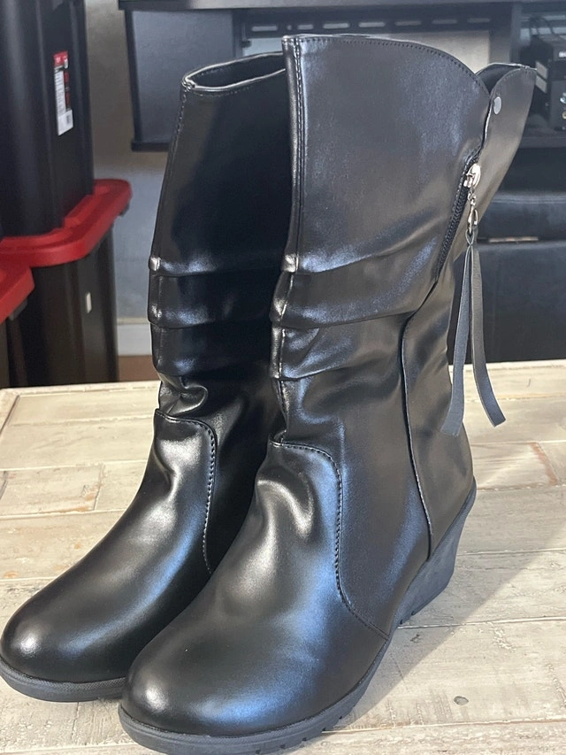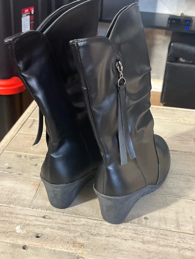 Step out in style with these black wedge heel boots in size 9. These boots feature a sleek design with a comfortable wedge heel, perfect for adding a touch of elegance to any outfit. These are brand new boots. If the ad is up, they're still available!