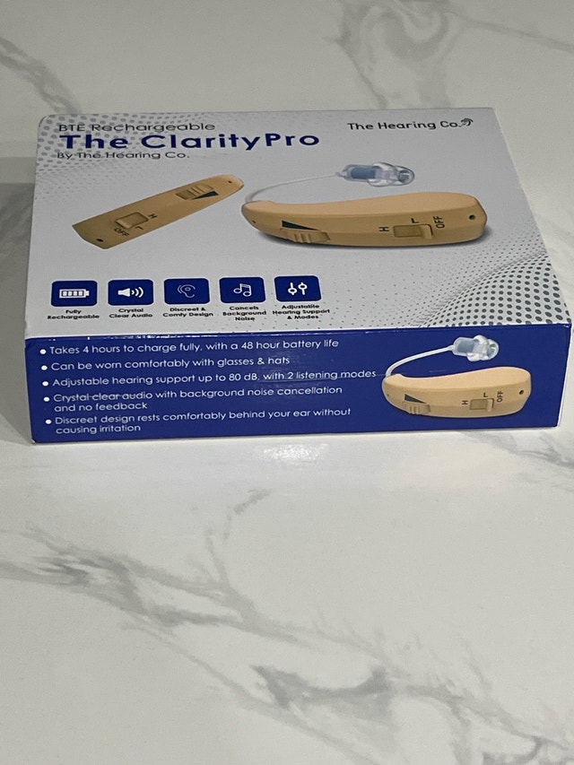 Experience crystal-clear audio with The ClarityPro BTE Rechargeable hearing aid, featuring discreet design and adjustable support up to 80 dB. These new hearing aids come complete with two listening modes. Here are some additional details: