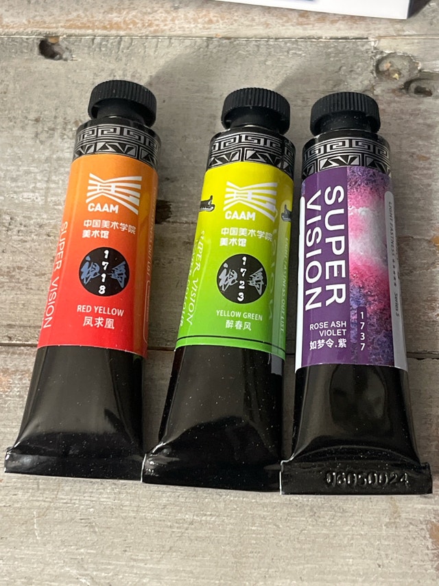 I'm selling a set of new Super Vision Artist's Watercolors, which includes three 15ml tubes in the colors Red Yellow, Yellow Green, and Rose Ash Violet, perfect for any artist looking to expand their palette. Here are the specifics: