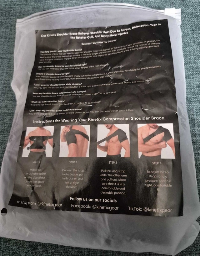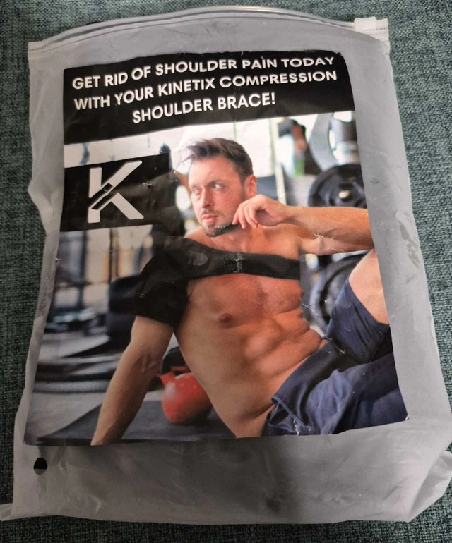 This Kinetix compression shoulder brace is designed to relieve shoulder pain due to sprains, dislocations, rotator cuff tears, and other injuries, offering support and stability. This item is brand new, still in its original packaging and has never been worn. Key Features: